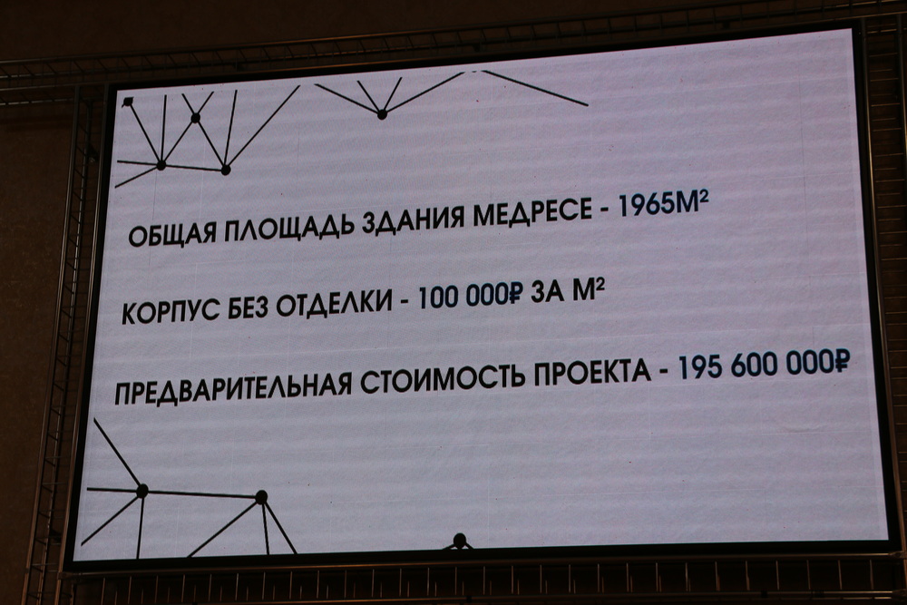 Одним из центральных моментов вечера стал благотворительный аукцион. В банкетном зале был продемонстрирован макет нового здания медресе. Его площадь составит 1965 квадратных метров, предварительная стоимость проекта – 195,6 млн рублей.