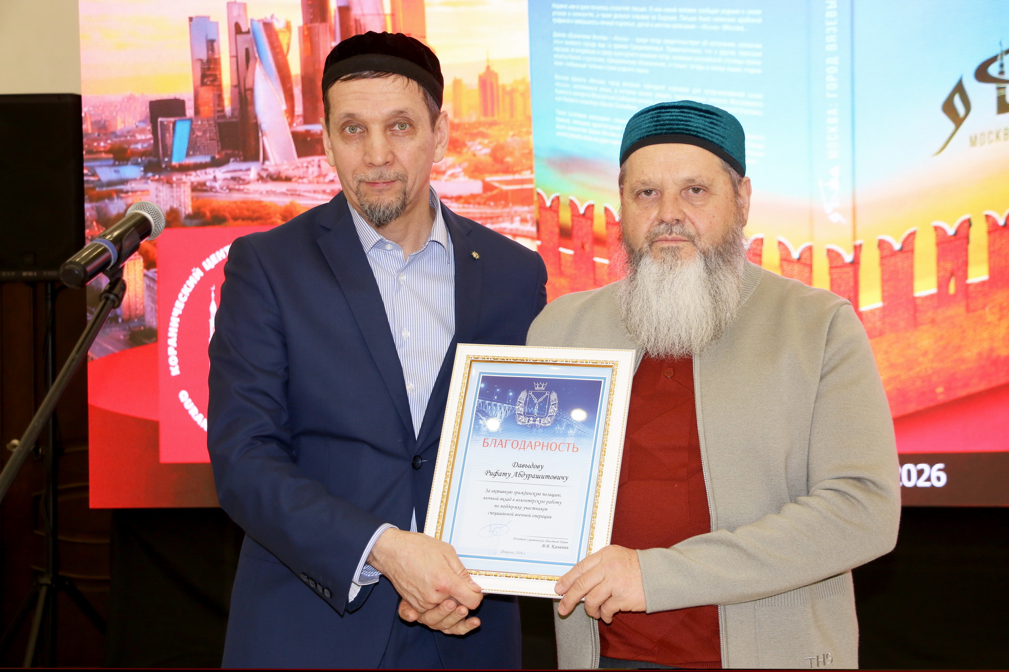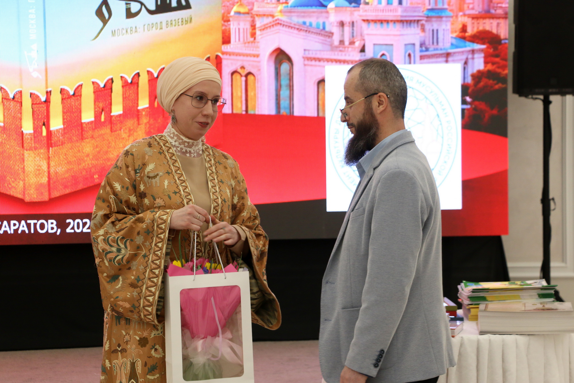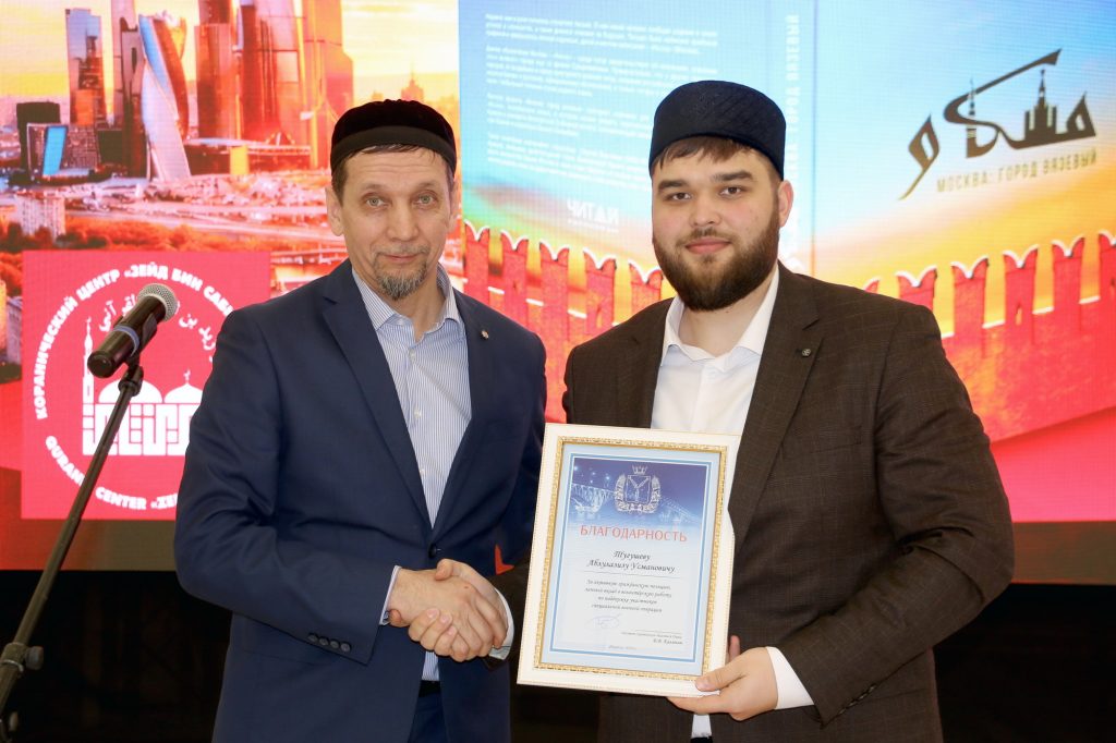 Ренат-хазрат Абянов и Ильшат-хазрат Салахутдинов в торжественной обстановке вручили экземпляры книги «Москва: город вязевый» руководителю культурно-просветительской организации «Возрождение» Рустаму-хаджи Абдульманову и первому заместителю председателя Татарской национально-культурной автономии Пензенской области, известному краеведу Рашиду Алюшеву. Также картины с иллюстрациями из книги «История в миниатюрах: путешествие по страницам Ислама в России» были вручены главе Духовного управления мусульман Поволжья, муфтию Мукаддасу-хазрату Бибарсову и муфтию ДУМ Саратовской области Расиму-хазрату Кузяхметову. Иллюстрация карманного мусхафа «Калям Шариф», которую нашли у погибшего воина в годы Великой Отечественной войны, была подарена руководителю коранического центра «Зейд бин Сабит» Ильясу-хазрату Ильясову.