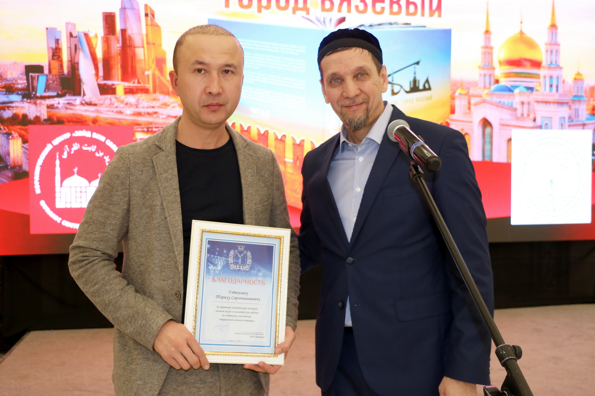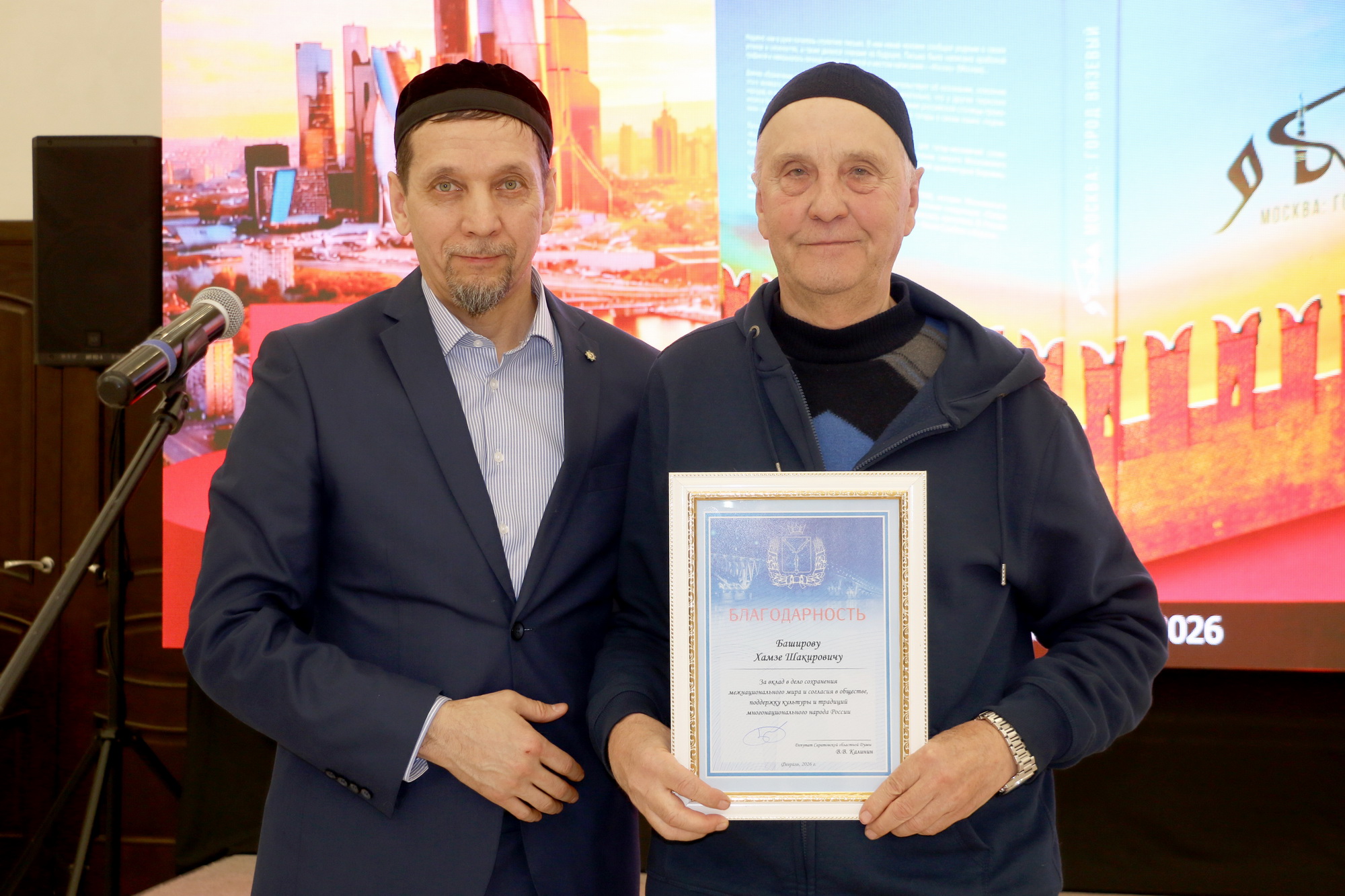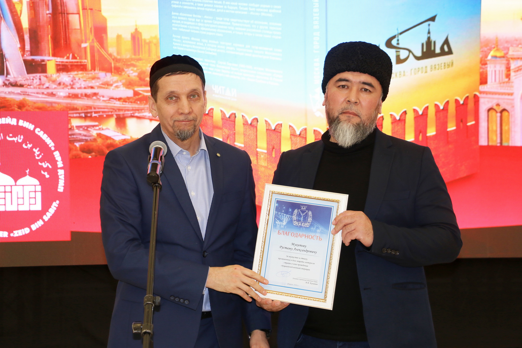 Ренат-хазрат Абянов и Ильшат-хазрат Салахутдинов в торжественной обстановке вручили экземпляры книги «Москва: город вязевый» руководителю культурно-просветительской организации «Возрождение» Рустаму-хаджи Абдульманову и первому заместителю председателя Татарской национально-культурной автономии Пензенской области, известному краеведу Рашиду Алюшеву. Также картины с иллюстрациями из книги «История в миниатюрах: путешествие по страницам Ислама в России» были вручены главе Духовного управления мусульман Поволжья, муфтию Мукаддасу-хазрату Бибарсову и муфтию ДУМ Саратовской области Расиму-хазрату Кузяхметову. Иллюстрация карманного мусхафа «Калям Шариф», которую нашли у погибшего воина в годы Великой Отечественной войны, была подарена руководителю коранического центра «Зейд бин Сабит» Ильясу-хазрату Ильясову.