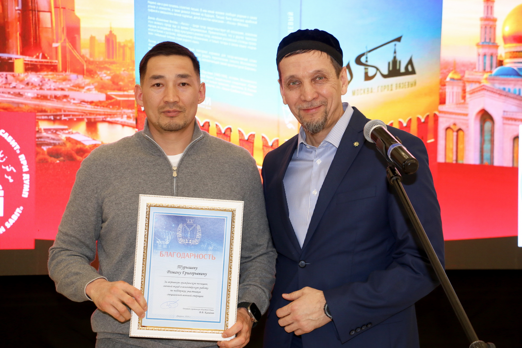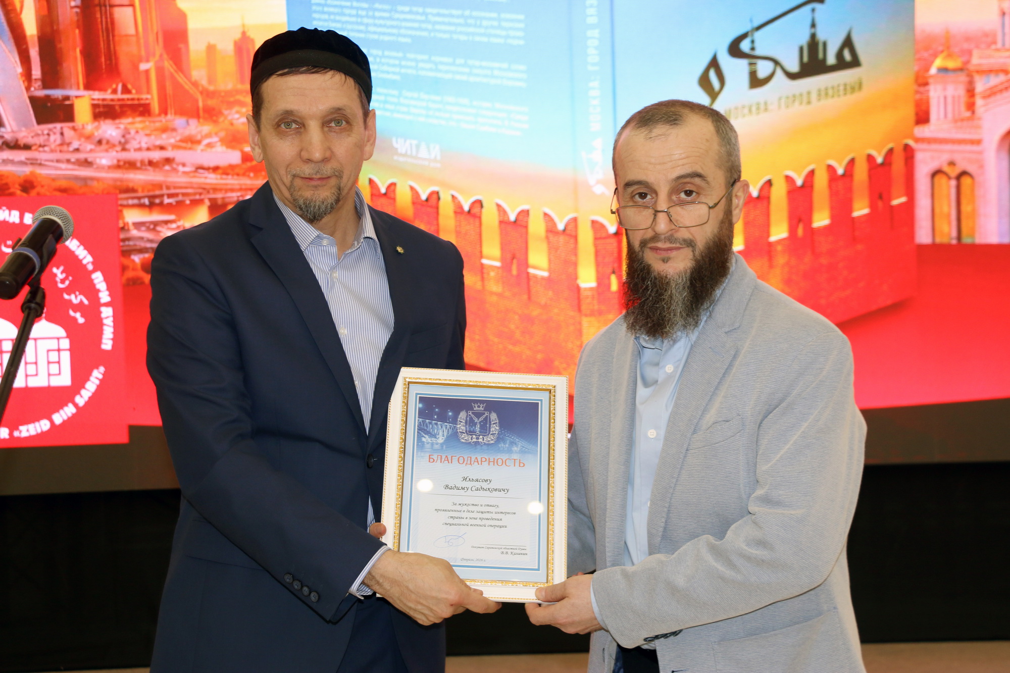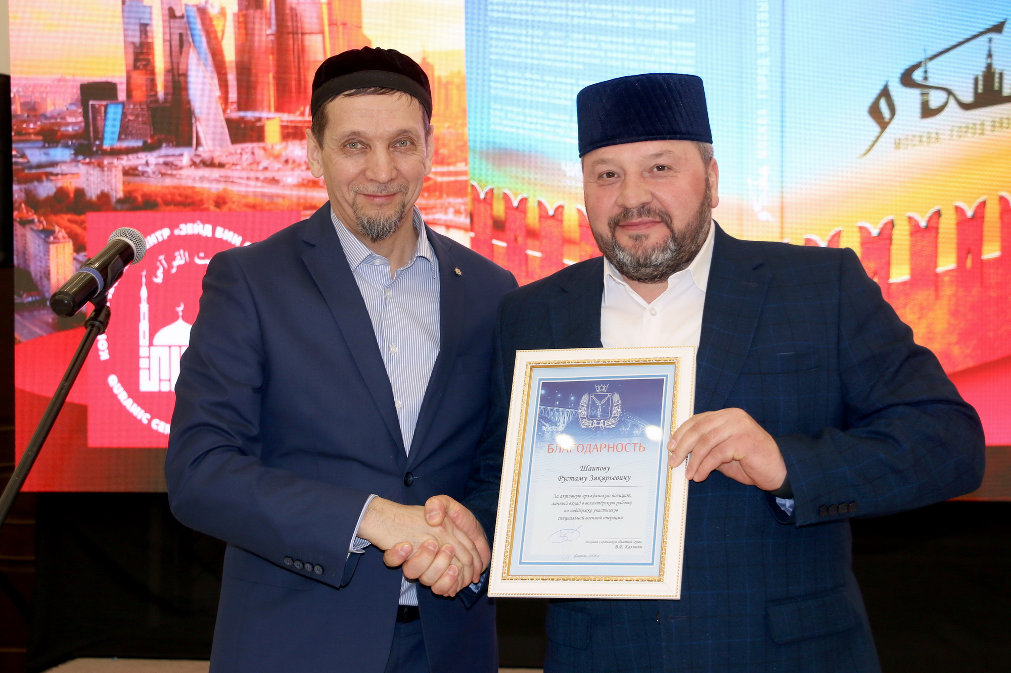 В рамках ужина заместитель главы ДУМ Поволжья Ахмед-хаджи Махметов от имени депутата Саратовской областной думы Вячеслава Калинина за мужество и отвагу, проявленные в деле защиты интересов страны в зоне проведения специальной военной операции вручил благодарности заместителю главы ДУМ Поволжья, имаму-хатыбу Саратовской Соборной мечети Рустаму-хазрату Мухитову и руководителю центра «Зейд бин Сабит» Ильясу-хазрату Ильясову. За вклад в дело сохранения межнационального мира и согласия в обществе, поддержку культуры и традиций многонационального народа России благодарность была выражена Салману-хаджи Мусаеву, Хамзе-хаджи Бяширову и Хаджимураду-хаджи Мурадову. За активную гражданскую позицию, личный вклад в волонтерскую работу по поддержке участников специальной военной операции благодарности получили Тарих Гатауллин, Рифат-хаджи Давыдов, Рустам Шаипов, Роман Турышев, а также преподаватели коранического центра Исмаил-устаз Шамшудинов и Абдулазиз-устаз Тугушев.