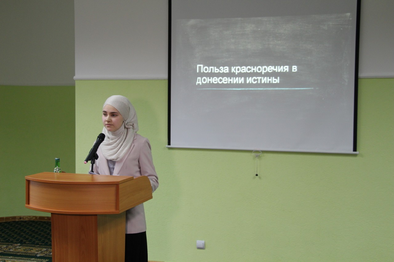Не менее интересный доклад представила студентка четвертого года обучения Марьям Дашкина, которая рассказала о пользе красноречия в донесении Истины. Лейтмотивом ее выступления стал призыв к совершенствованию ораторского мастерства, особенно имамами. Она дала ряд практических рекомендаций для достижения грамотной и красивой речи.