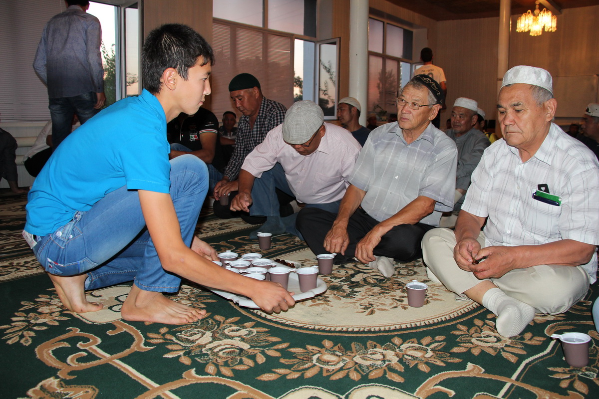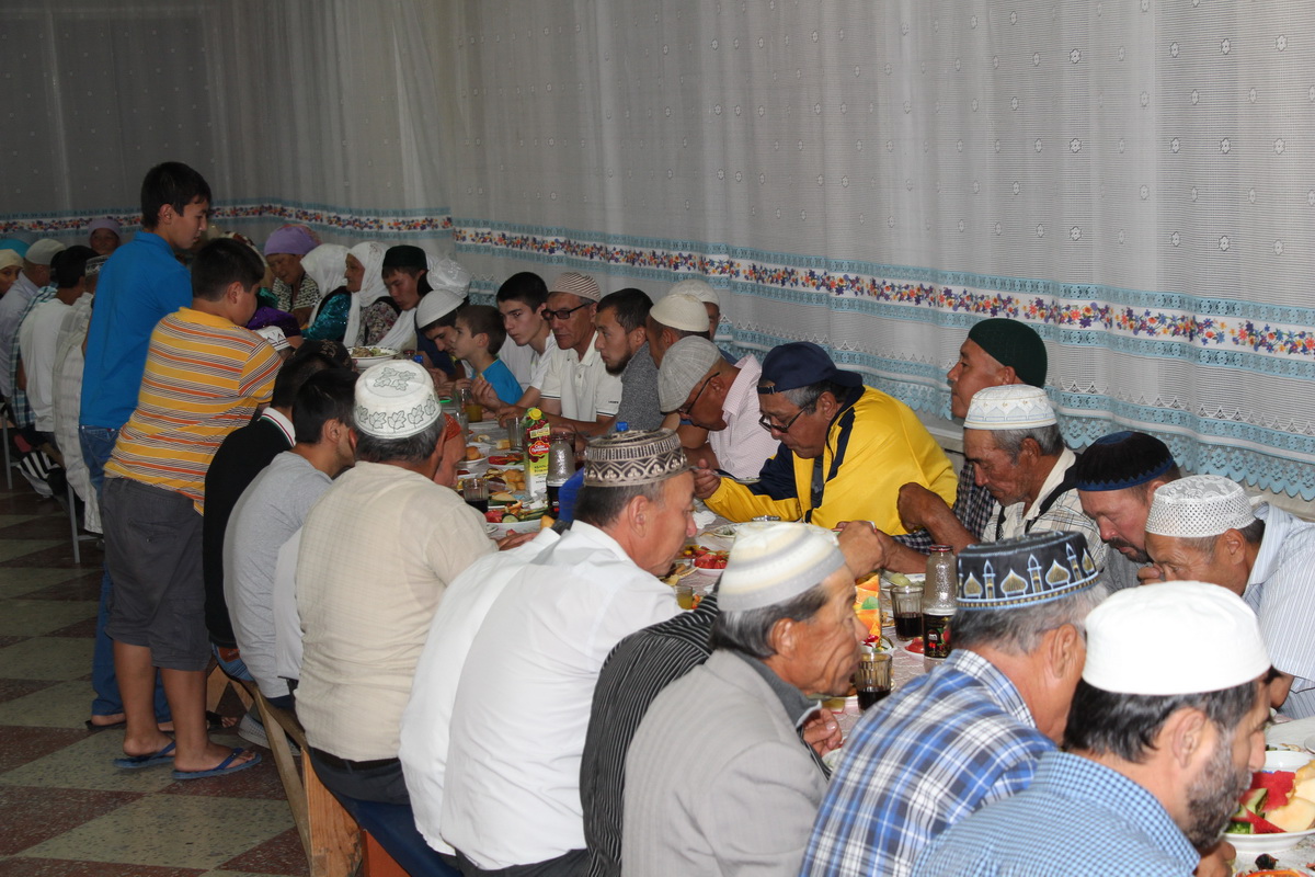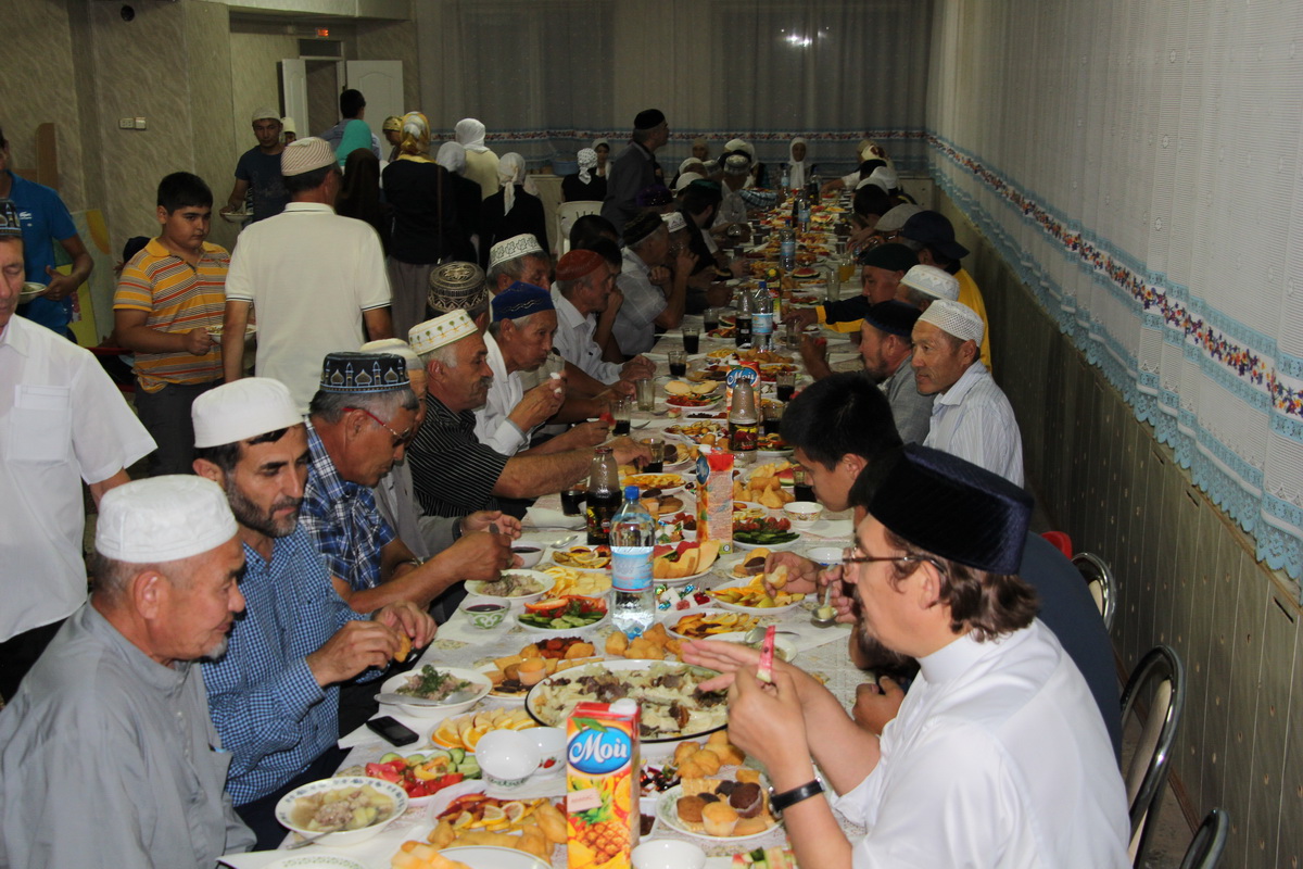 С наступлением Магриб-намаза зазвучал азан, а значит, наступило время вкусить финики и воду, впервые после очередного дня поста. Затем верующие совершили коллективную молитву и отправились к праздничному столу с разнообразными национальными яствами.