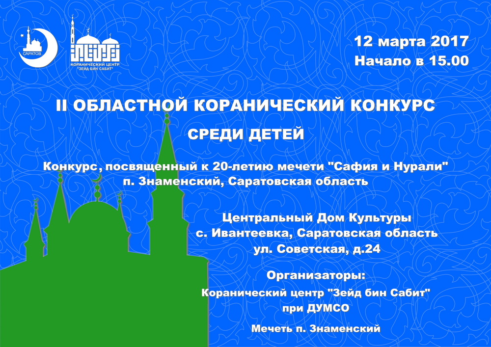 II Областной коранический конкурс среди детей пройдет в Доме культуры Ивантеевского района. Начало в 15.00.