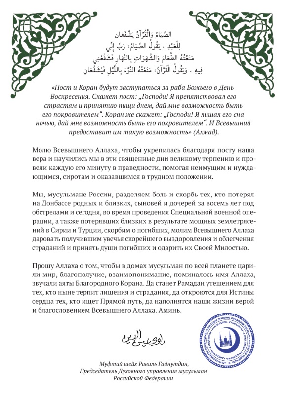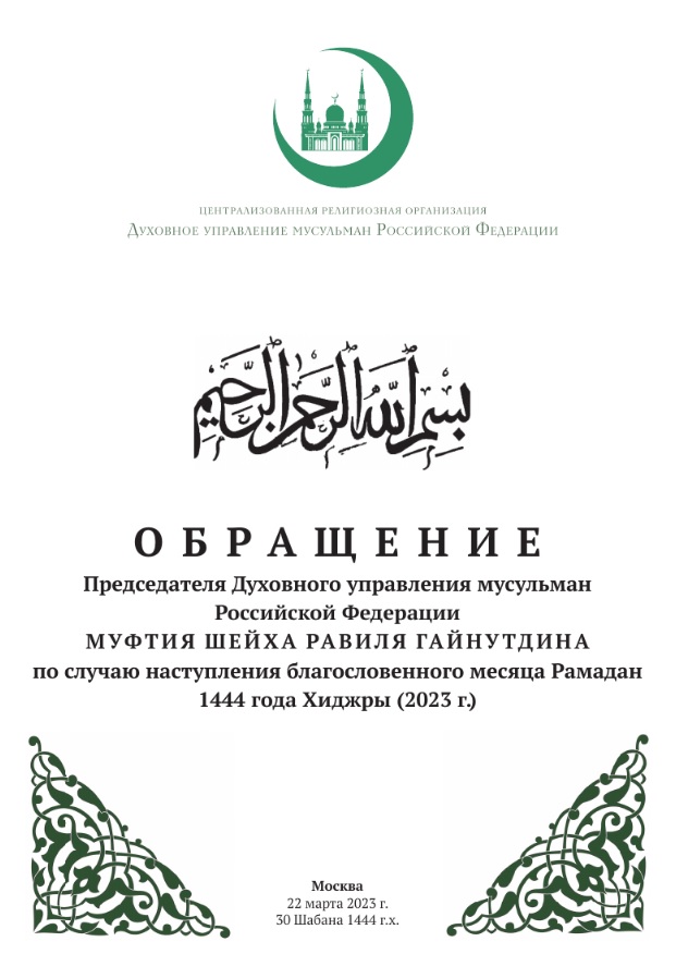 Обращение председателя Духовного управления мусульман Российской Федерации муфтия шейха Равиля Гайнутдина по случаю наступления благословенного месяца Рамадан 1444 года Хиджры (2023 г.). Навигация по записям Заместитель муфтия Саратовской области награжден благодарственным письмом ПОЗДРАВЛЕНИЕ