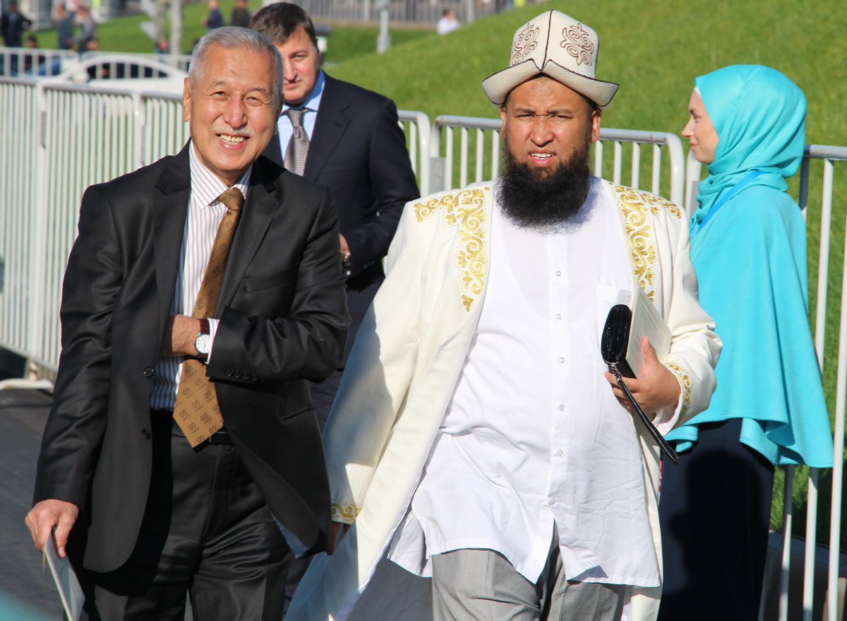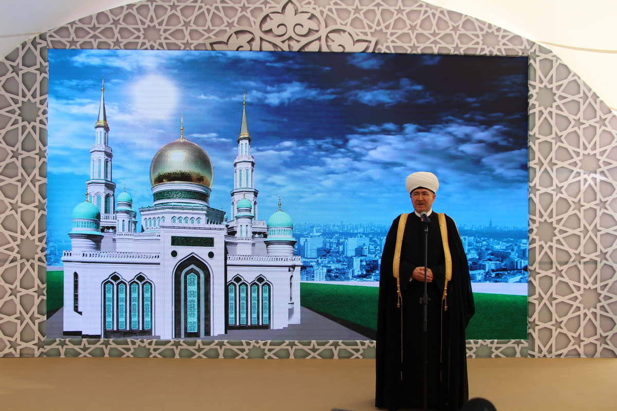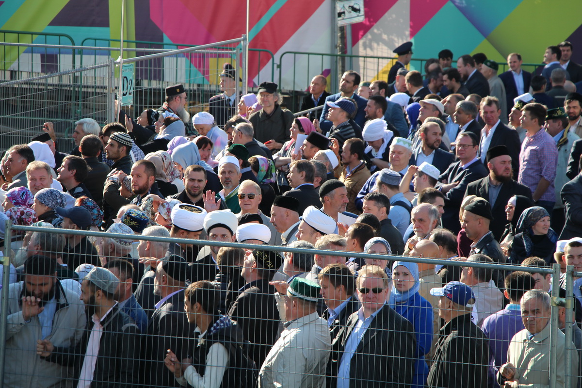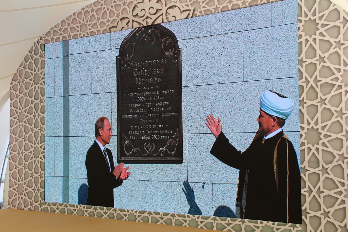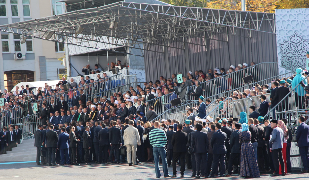 Заняв свои места, мне и моим коллегам оставалось делать хорошие исторические снимки и пить кофе со сливками. За несколько минут до официального начала мероприятия к прессе подошел председатель Духовного управления мусульман Российской Федерации Равиль-хазрат Гайнутдин. Остальных vip-участников церемонии приходилось ловить объективом на трибунах, которые, кстати и, к сожалению, располагались в метрах ста от пресс-центра, что создавало определенные трудности в работе. А вот выступающих на сцене приходилось наблюдать лишь на большом экране.