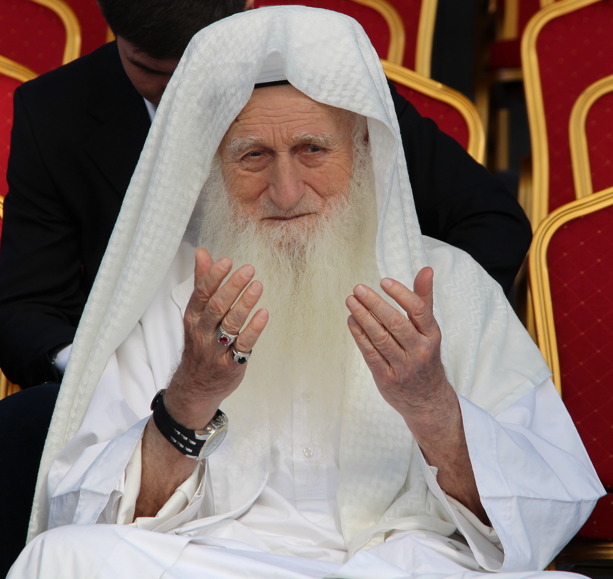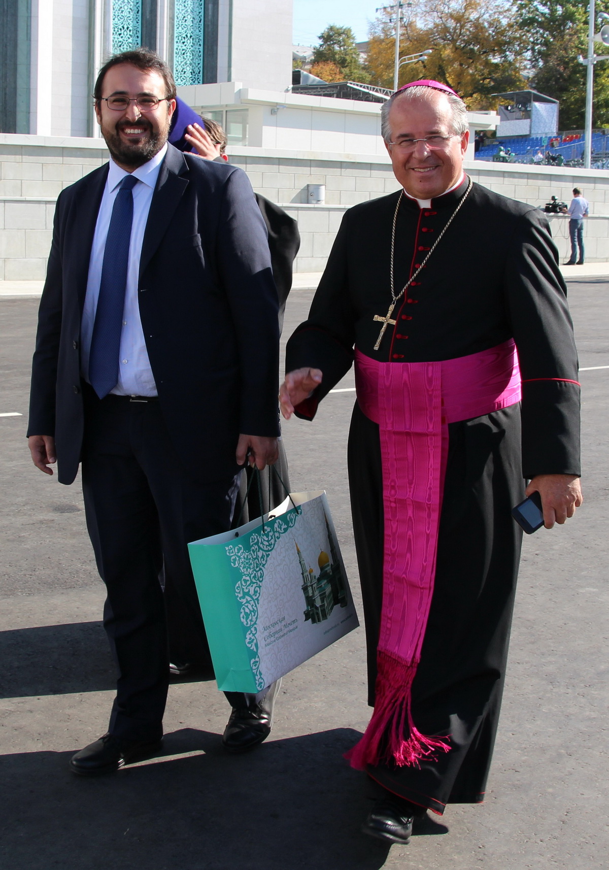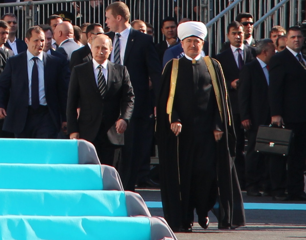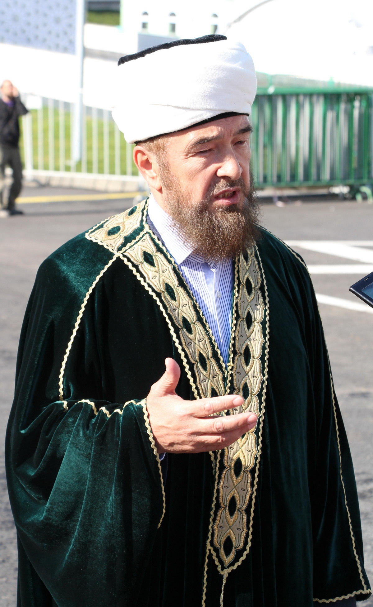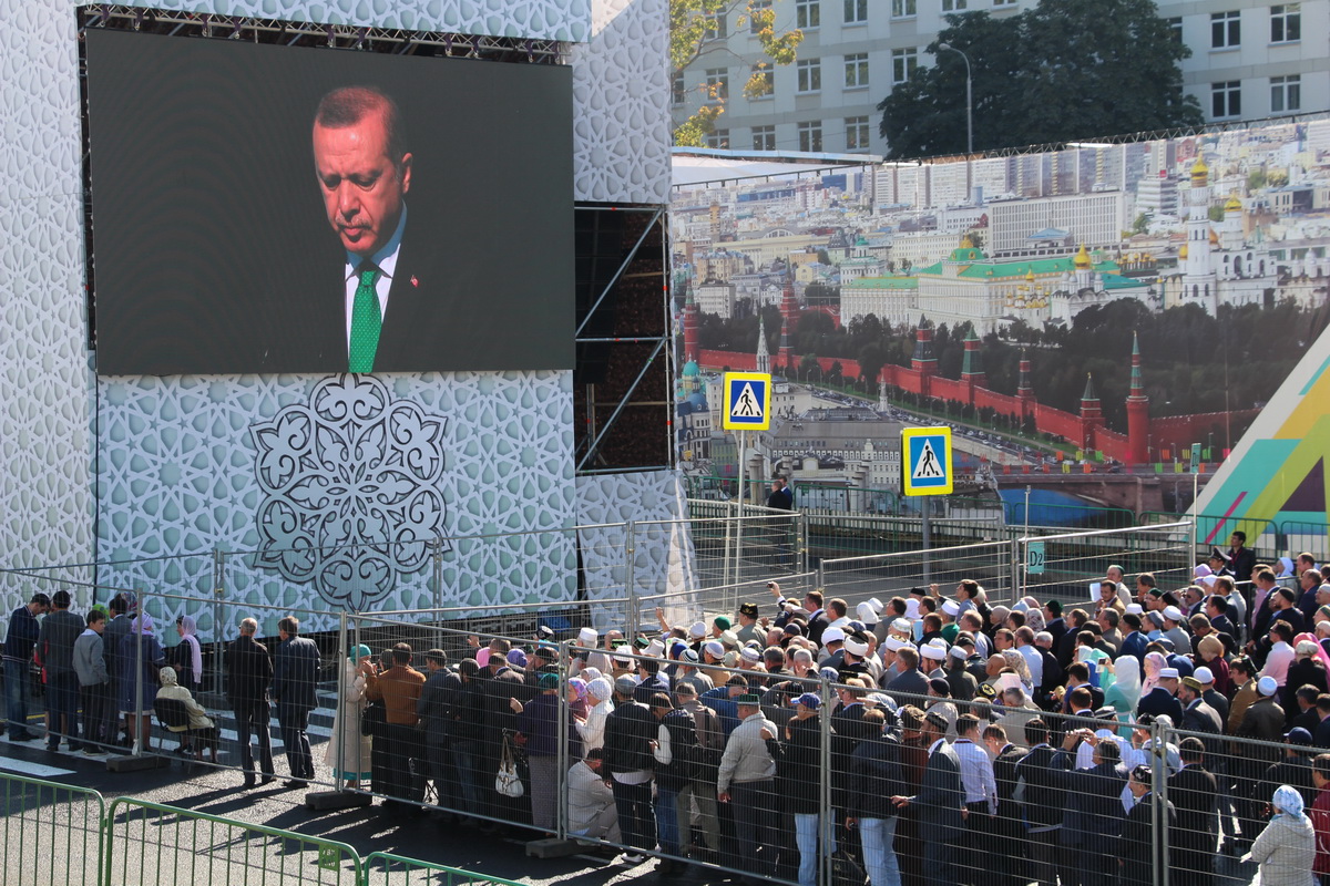 Заняв свои места, мне и моим коллегам оставалось делать хорошие исторические снимки и пить кофе со сливками. За несколько минут до официального начала мероприятия к прессе подошел председатель Духовного управления мусульман Российской Федерации Равиль-хазрат Гайнутдин. Остальных vip-участников церемонии приходилось ловить объективом на трибунах, которые, кстати и, к сожалению, располагались в метрах ста от пресс-центра, что создавало определенные трудности в работе. А вот выступающих на сцене приходилось наблюдать лишь на большом экране.