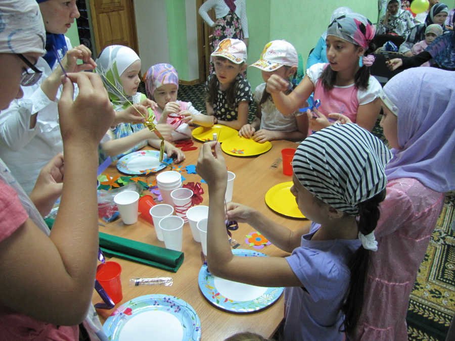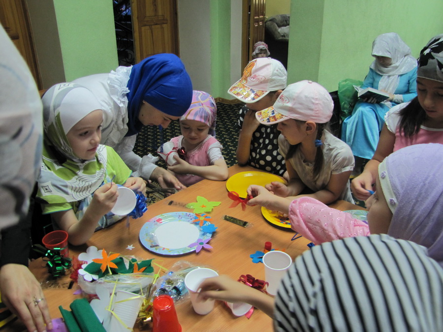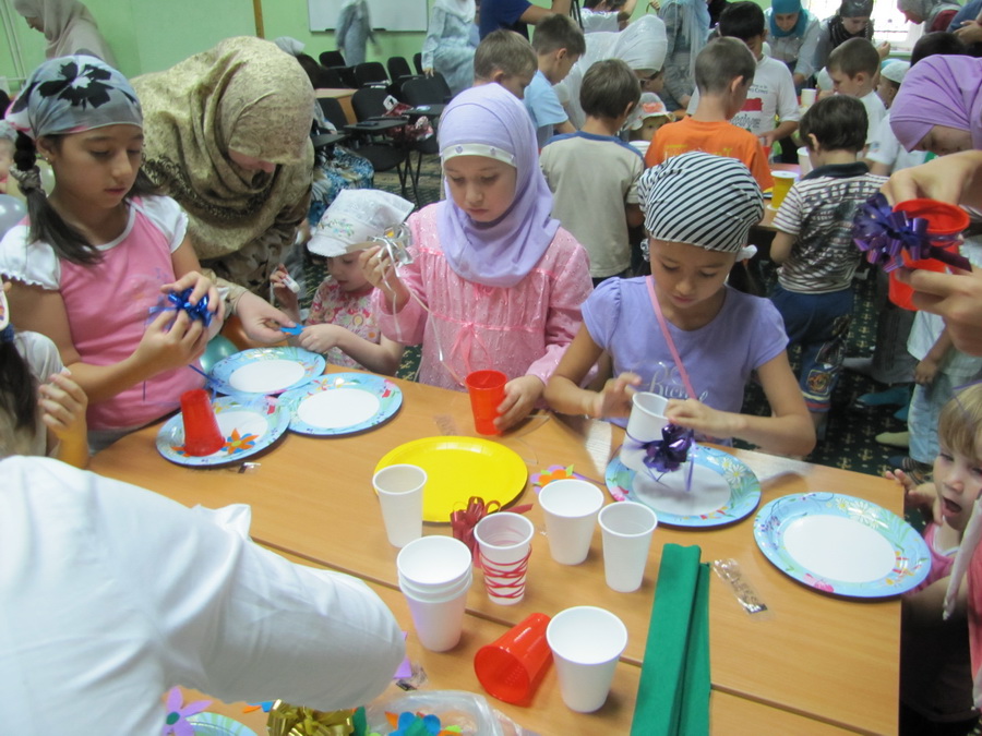 Затем дружно с представительницами «Родника» дети своими руками изготовили посуду для ифтара, которую должны были подарить мамам и папам. Ребята украшали ее бантиками, цветочками, разноцветными лентами и т.д. Как только все было готово, счастливые маленькие мусульмане бежали к родителям и вручали им свои подарки.