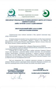 Избранному председателю Координационного центра мусульман Северного Кавказа шейху муфтию Салаху хаджи Межиеву