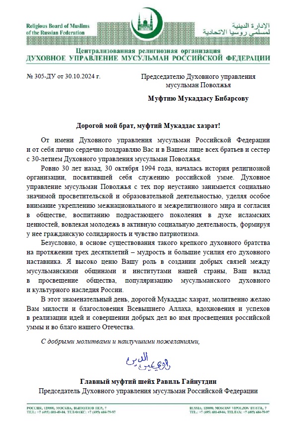 От имени Духовного управления мусульман Российской Федерации и от себя лично сердечно поздравляю Вас и в Вашем лице всех братьев и сестер с 30-летием Духовного управления мусульман Поволжья.