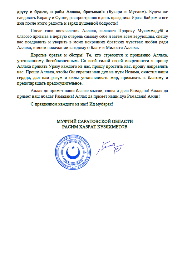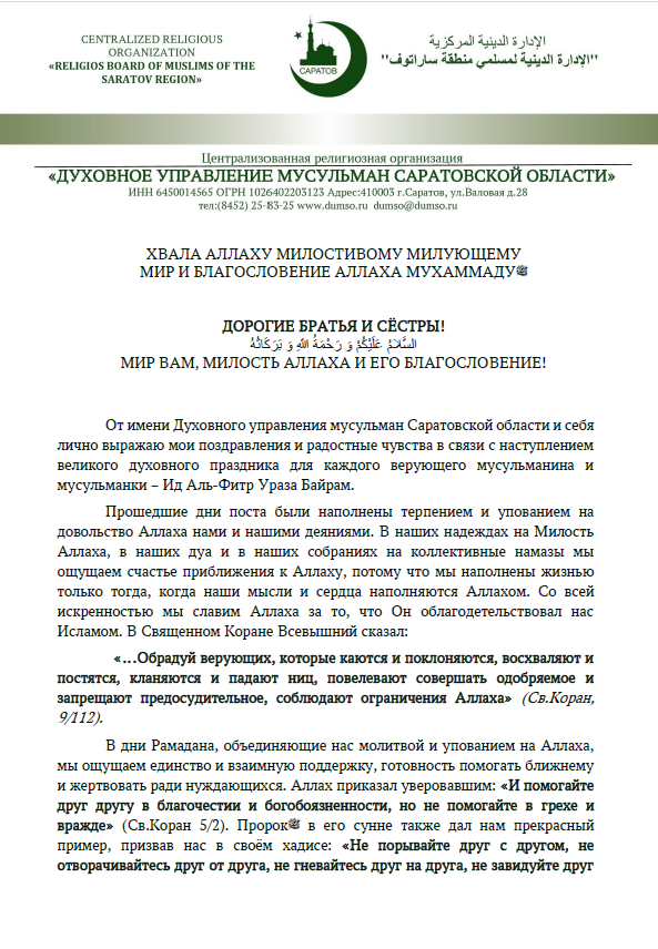 От имени Духовного управления мусульман Саратовской области и себя лично выражаю мои поздравления и радостные чувства в связи с наступлением великого духовного праздника для каждого верующего мусульманина и мусульманки – Ид Аль-Фитр (Ураза Байрам).