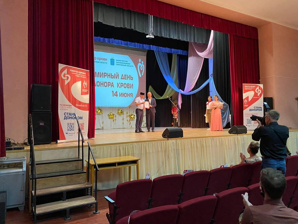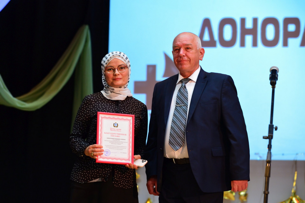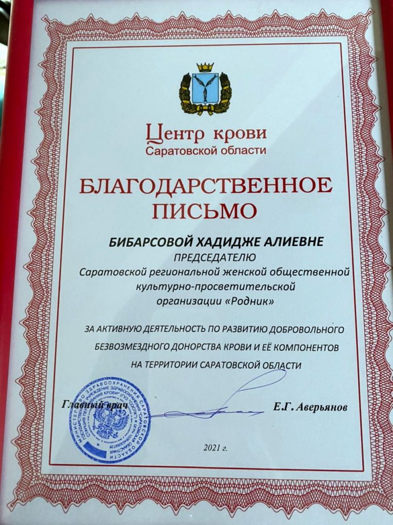 В ходе торжественного мероприятия благодарственным письмом за активную деятельность по развитию добровольного безвозмездного донорства крови и ее компонентов на территории Саратовской области была награждена руководитель женской общественной организации «Родник» Хадиджа Бибарсова.