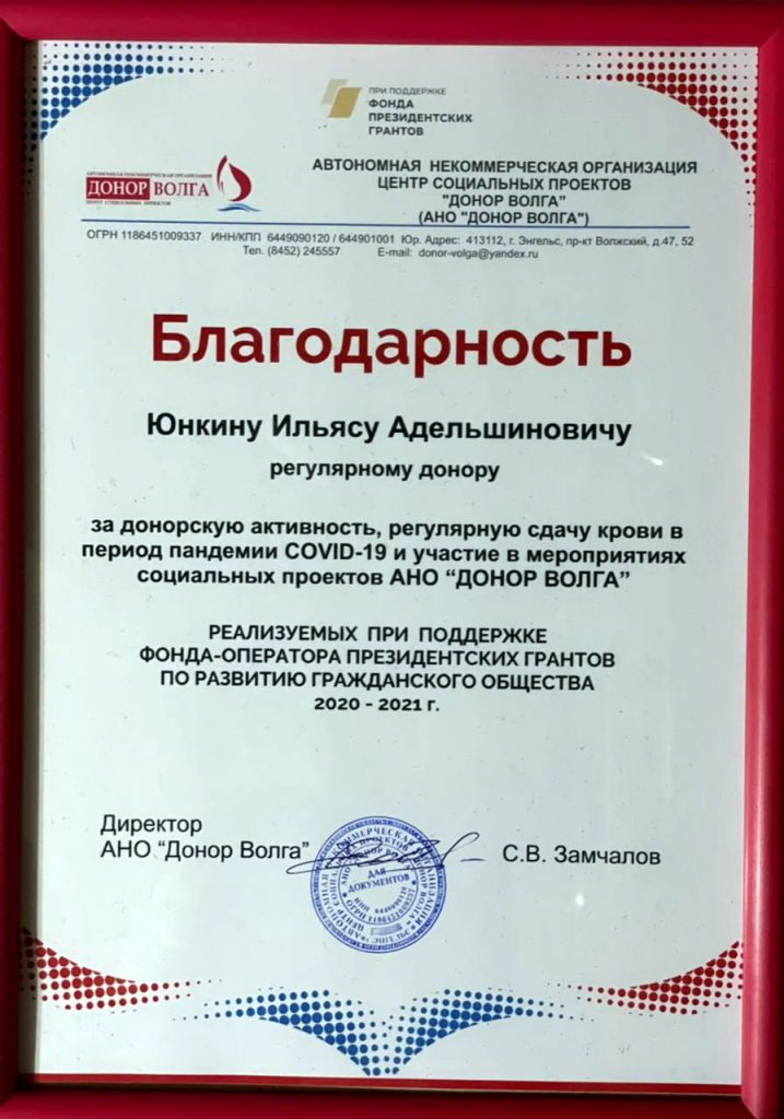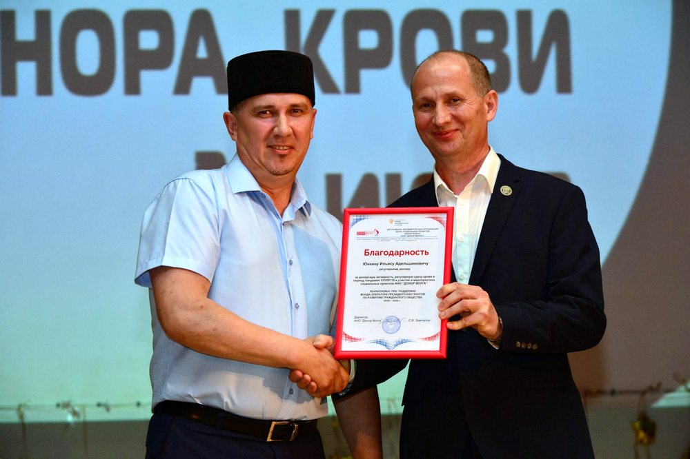 Имам-мухтасиб Балашовского района Ильяс-хазрат Юнкин является донором крови на протяжении многих лет. В рамках мероприятия ему вручили благодарность за донорскую активность, регулярную сдачу крови в период пандемии COVID-19 и участие в мероприятиях социальных проектов АНО «Донор Волга», реализуемых при поддержке Фонда-оператора президентских грантов по развитию гражданского общества 2020-2021 г.