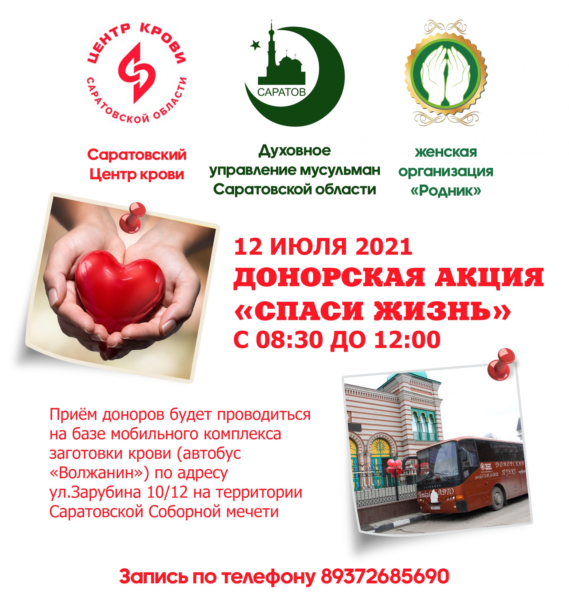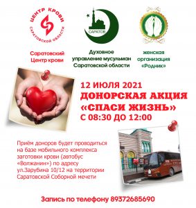 Донорская акция будет проходить 12 июля 2021 года с 8:30 до 12.00 по адресу г.Саратов, ул.Зарубина 10/12 (возле Саратовской Соборной мечети).