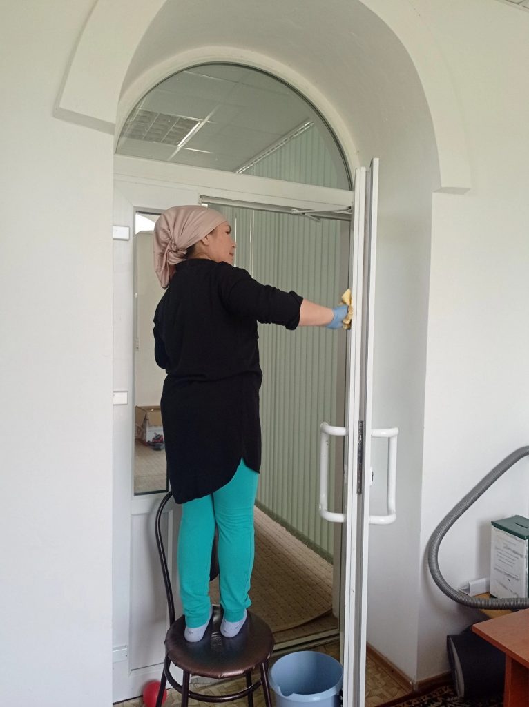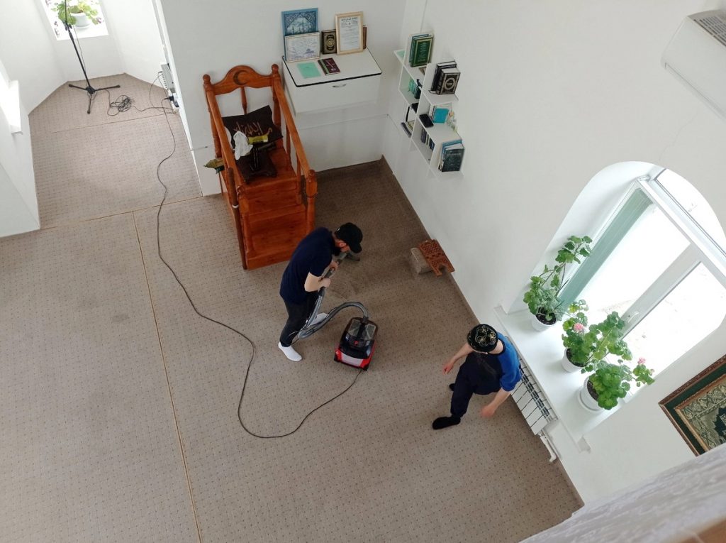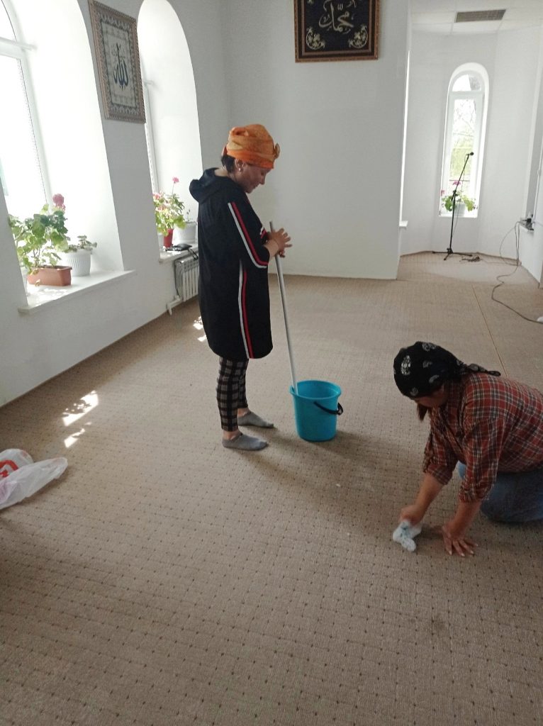 Как рассказал имам-хатыб озинской мечети «Сания» Саид-хазрат Каримов, в ходе генеральной уборки совместными усилиями были почищены ковровые покрытия внутри мечети и помыты окна.