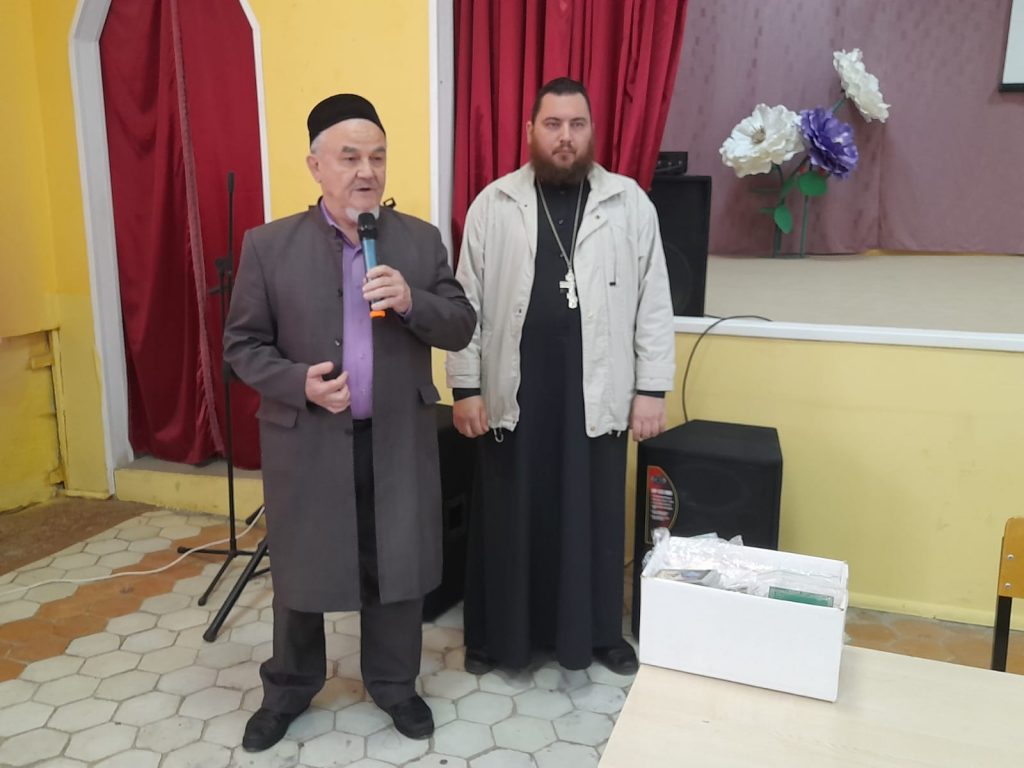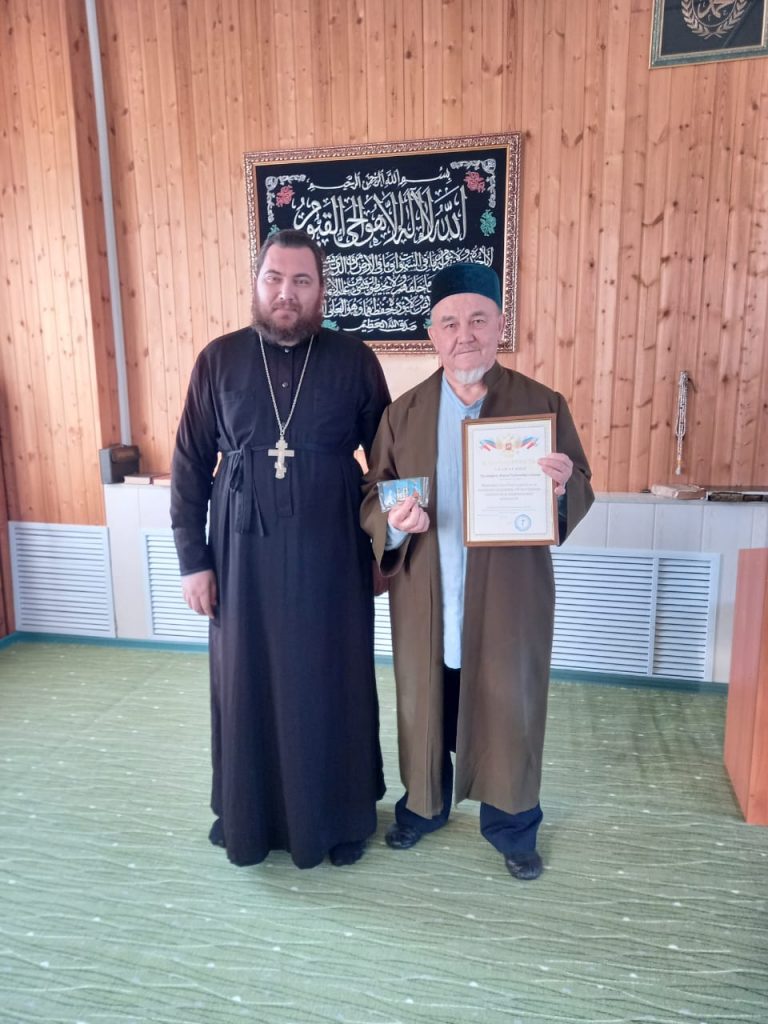 Местный священник Владислав Тихонов выразил признательность Фариду-хазрату Мустафину и вручил ему благодарственное письмо за поддержку традиционных ценностей.