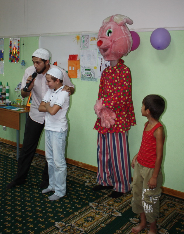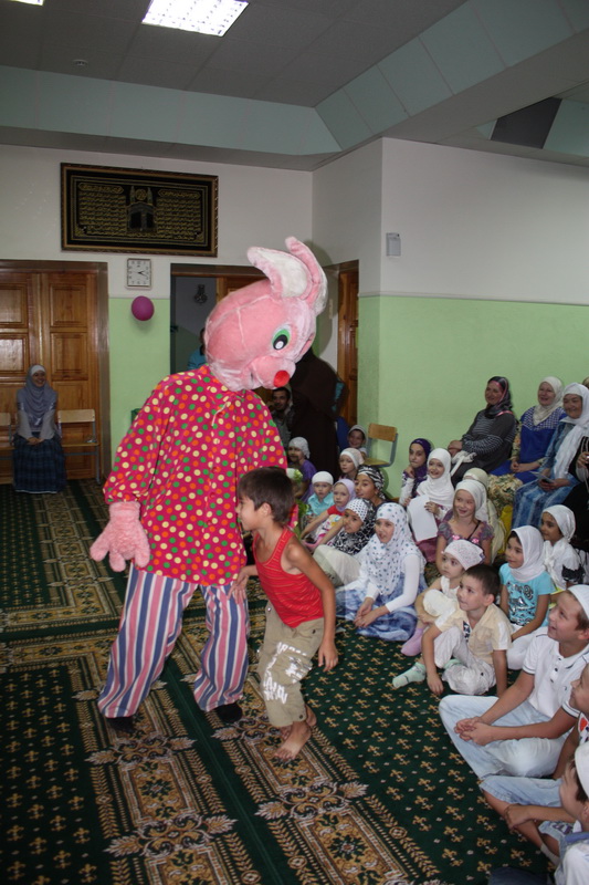 Сюрпризом для юных мусульман в завершении праздника стало появление костюмированного зайца, который поиграл с ребятами в интересную игру и подарил всем мороженое.