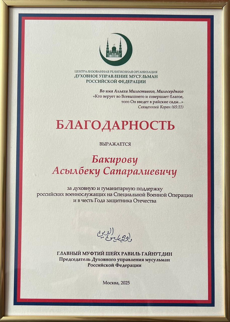 Имам-мухтасиб Краснокутского района Хамза-хазрат Бакиров удостоен благодарности председателя ДУМ РФ, Главного муфтия шейха Равиля Гайнутдина «за духовную и гуманитарную поддержку российских военнослужащих на СВО и в честь Года защитника Отечества».