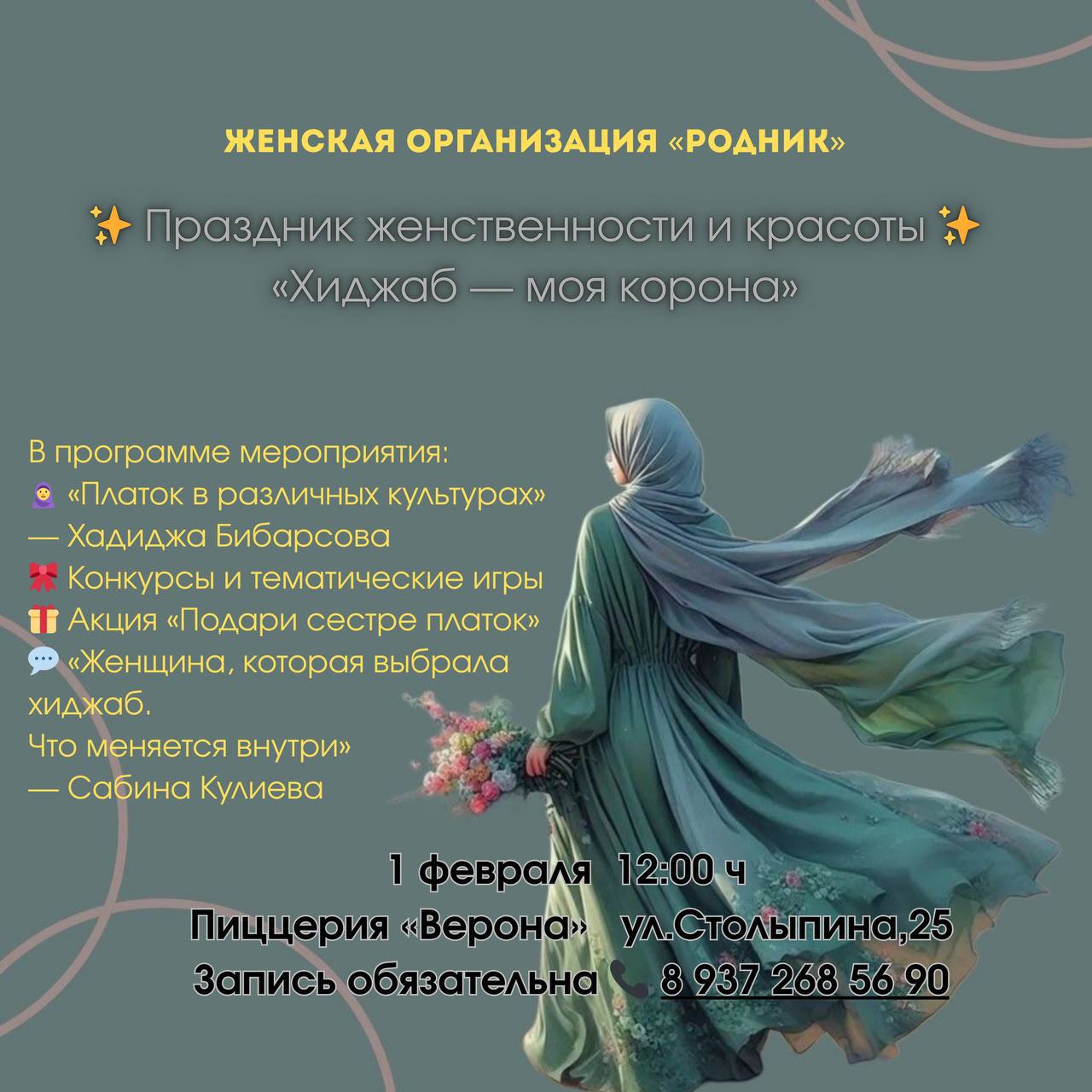 Мероприятие пройдет в халяльном кафе «Верона». В программе: лекция руководителя организации Хадиджа-ханум Бибарсовой «Платок в различных культурах», акция «Подари сестре платок», а также конкурсы и тематические игры.