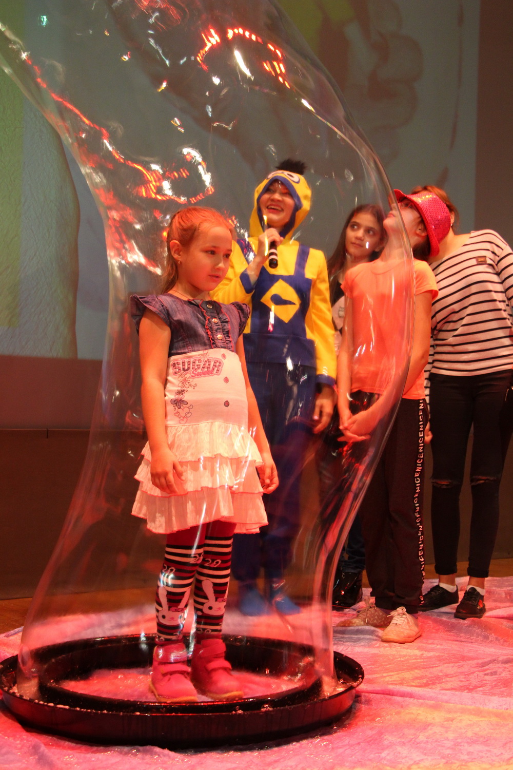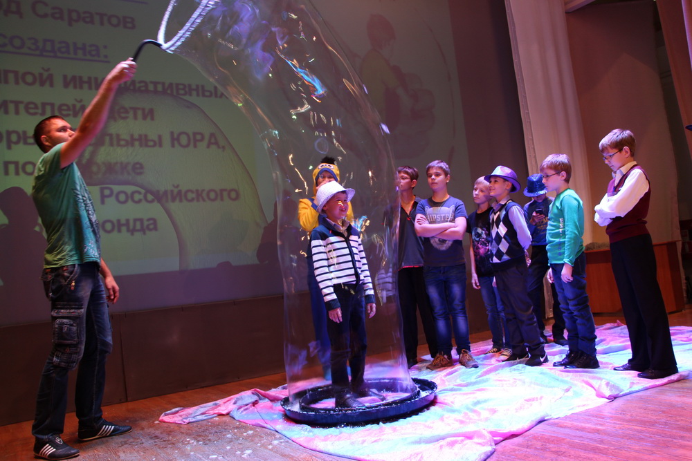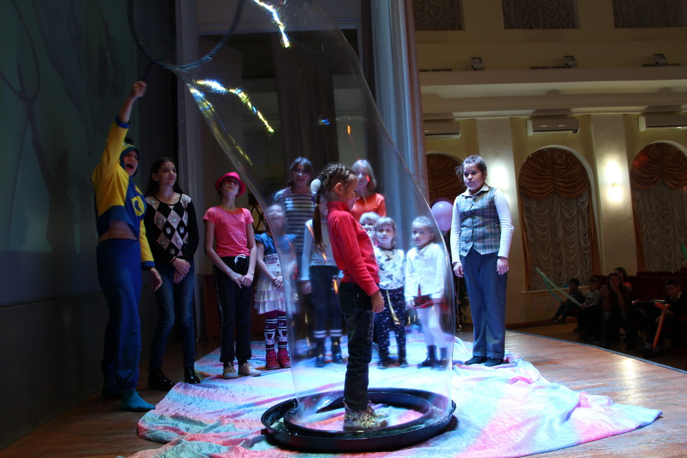 Кульминацией встречи стало настоящее шоу мыльных пузырей. Каждый ребенок смог стать его героем и побывать внутри большего пузыря.