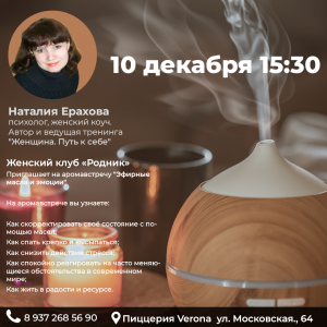 Аромавстреча «Эфирные масла и эмоции» состоится 10 декабря 2022 года в пиццерии Verona (ул.Радищева 32).