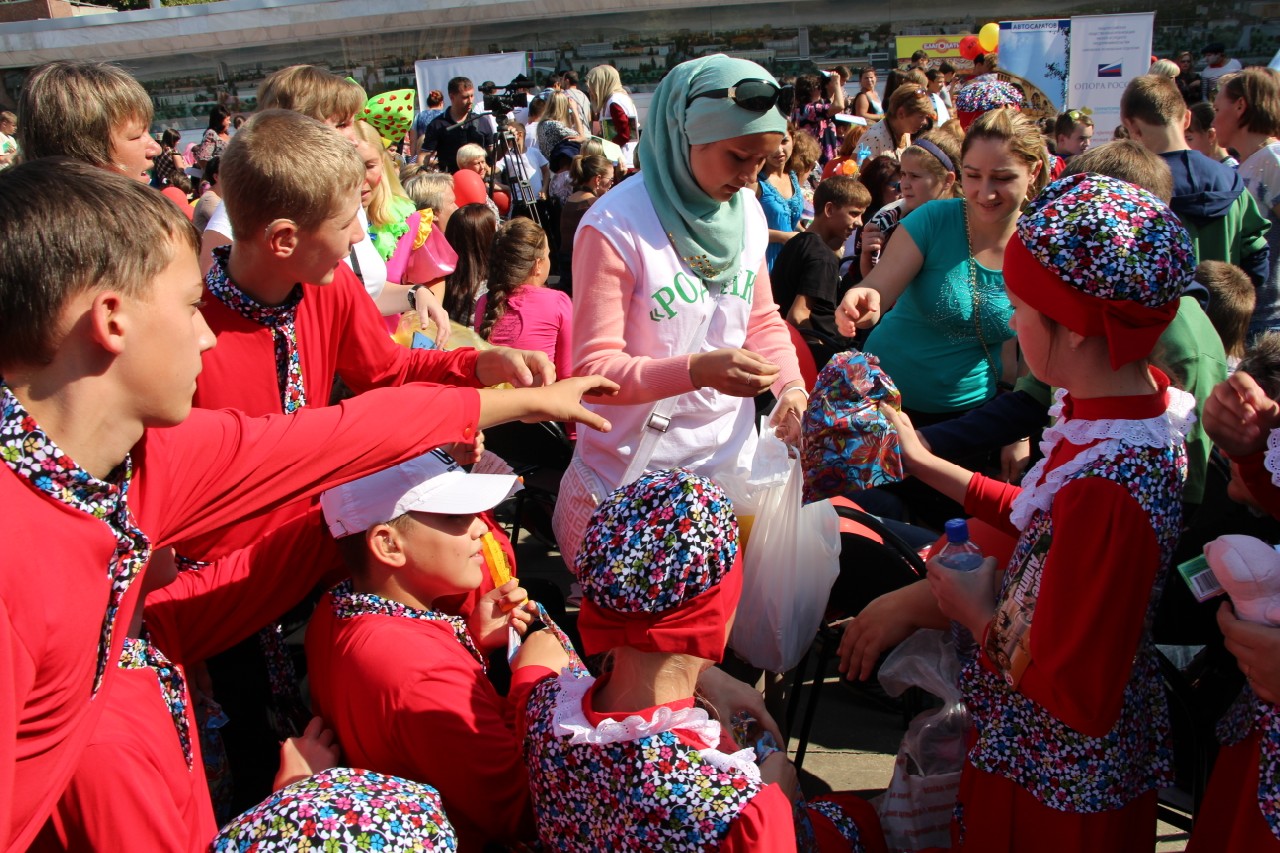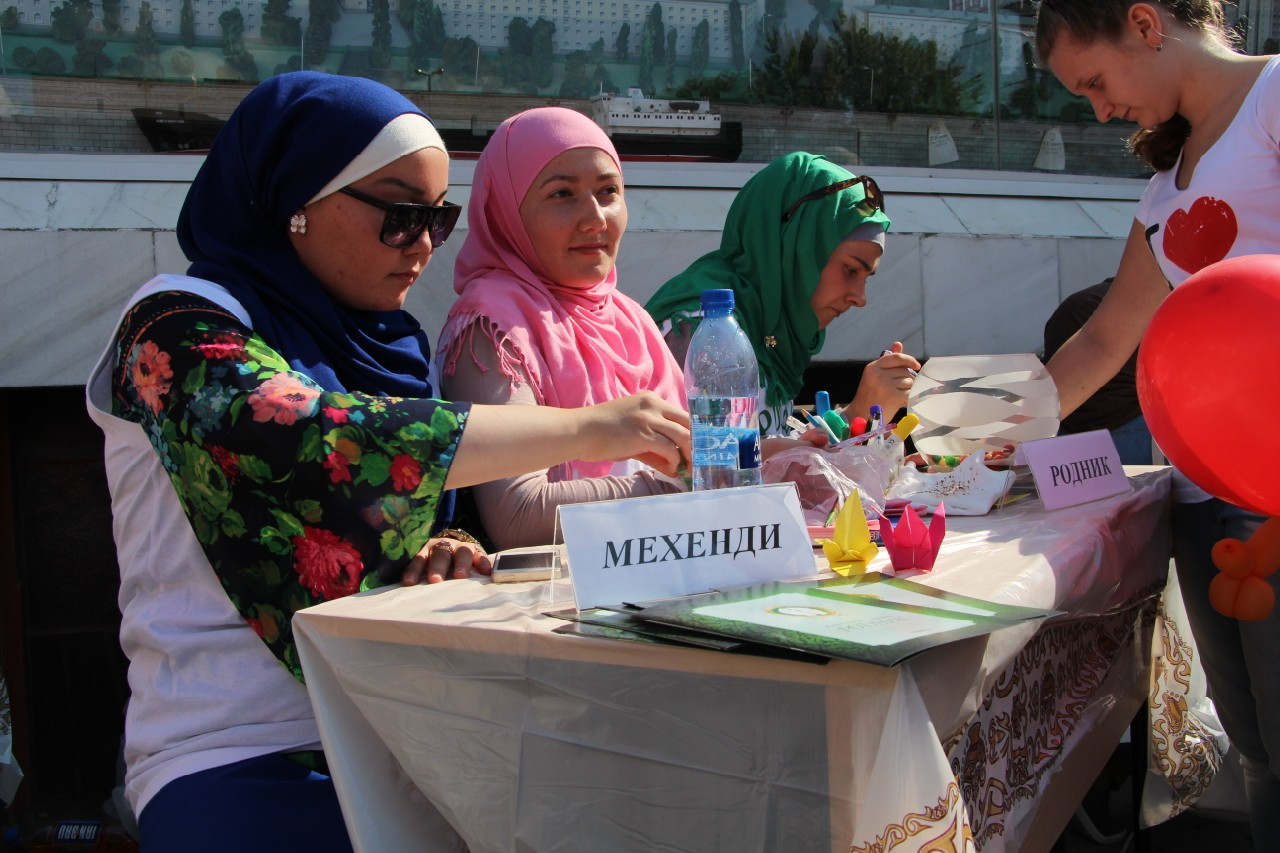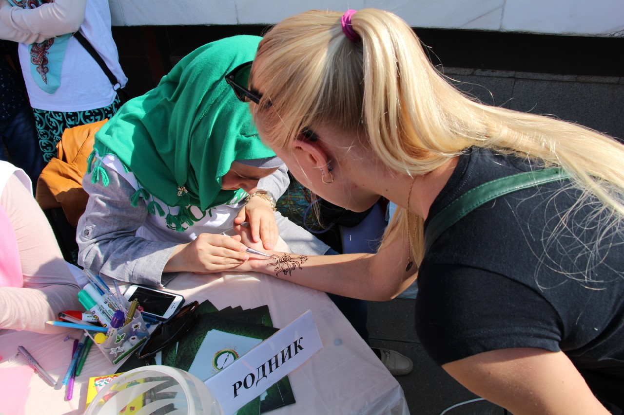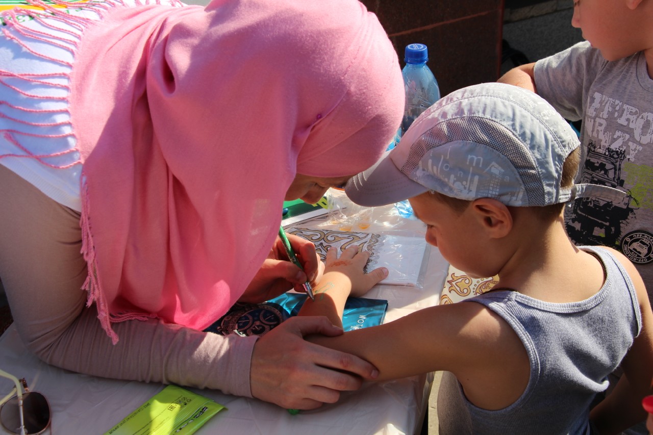 Девушки из «Родника» на воскресном фестивале провели мастер-класс по мехенди и аквагримму для всех желающих. Они наносили на лица и руки ребятишек красивые рисунки из специальных красок и хноя, даря им море радости и улыбок. Такое занятие оказалось многим по душе, и от начала до конца мероприятия вокруг стола с красками толпилось множество детишек. Кроме этого активистки «Родника» преподнесли детям-инвалидам подарки со сладостями.
