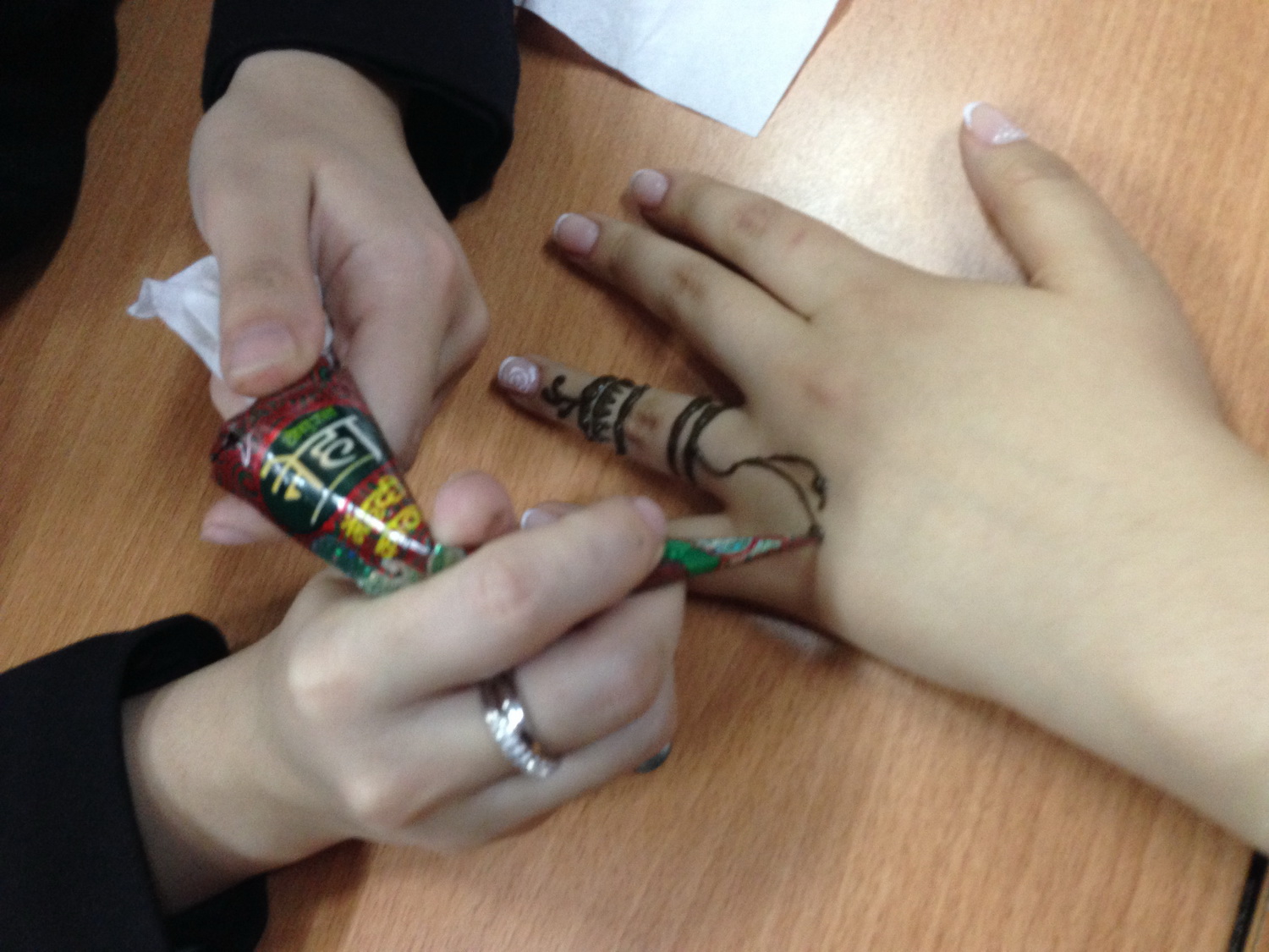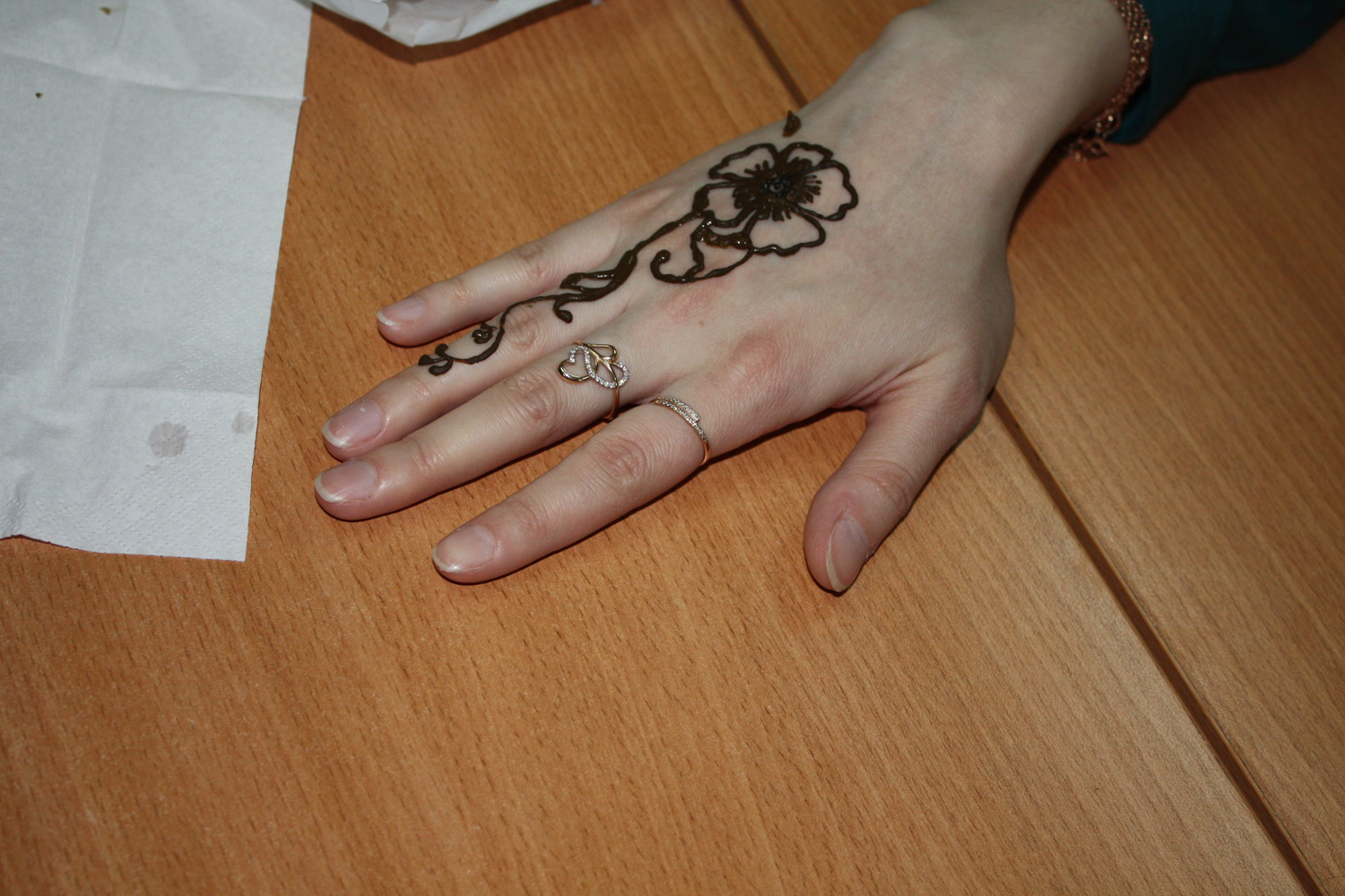 Кроме того большая очередь выстроилась за красивым рисунком из хны — сложные узоры Мехенди украсили руки посетительниц.