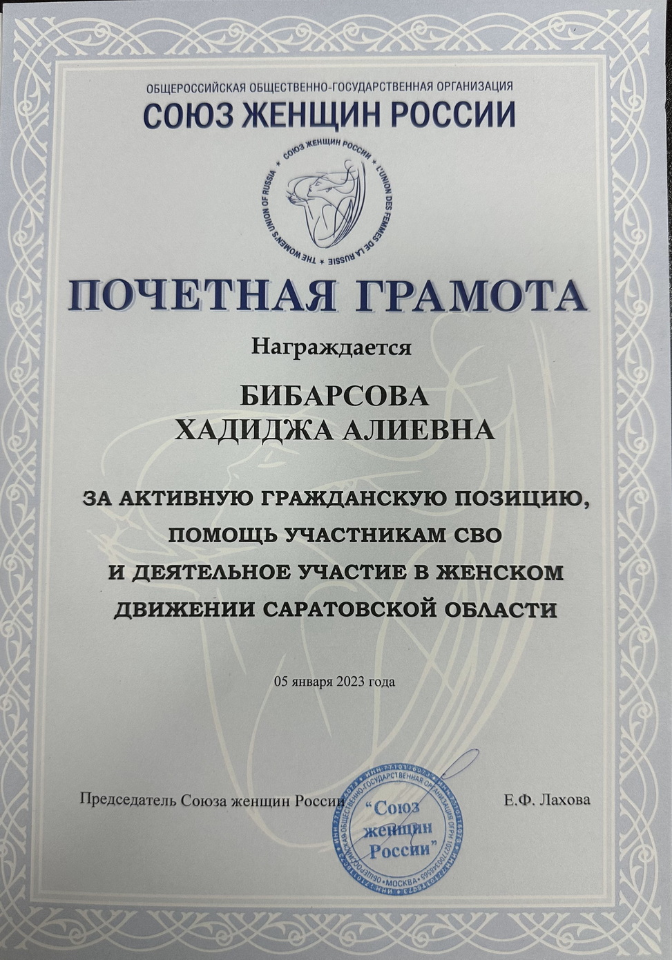 В ходе форума также состоялось награждение Почетными грамотами «Союза женщин России» наиболее отличившихся в общественной деятельности представительниц прекрасного пола. Памятный документ «за активную гражданскую позицию, помощь участникам специальной военной операции и деятельное участие в женском движении области» получила Хадиджа Бибарсова.