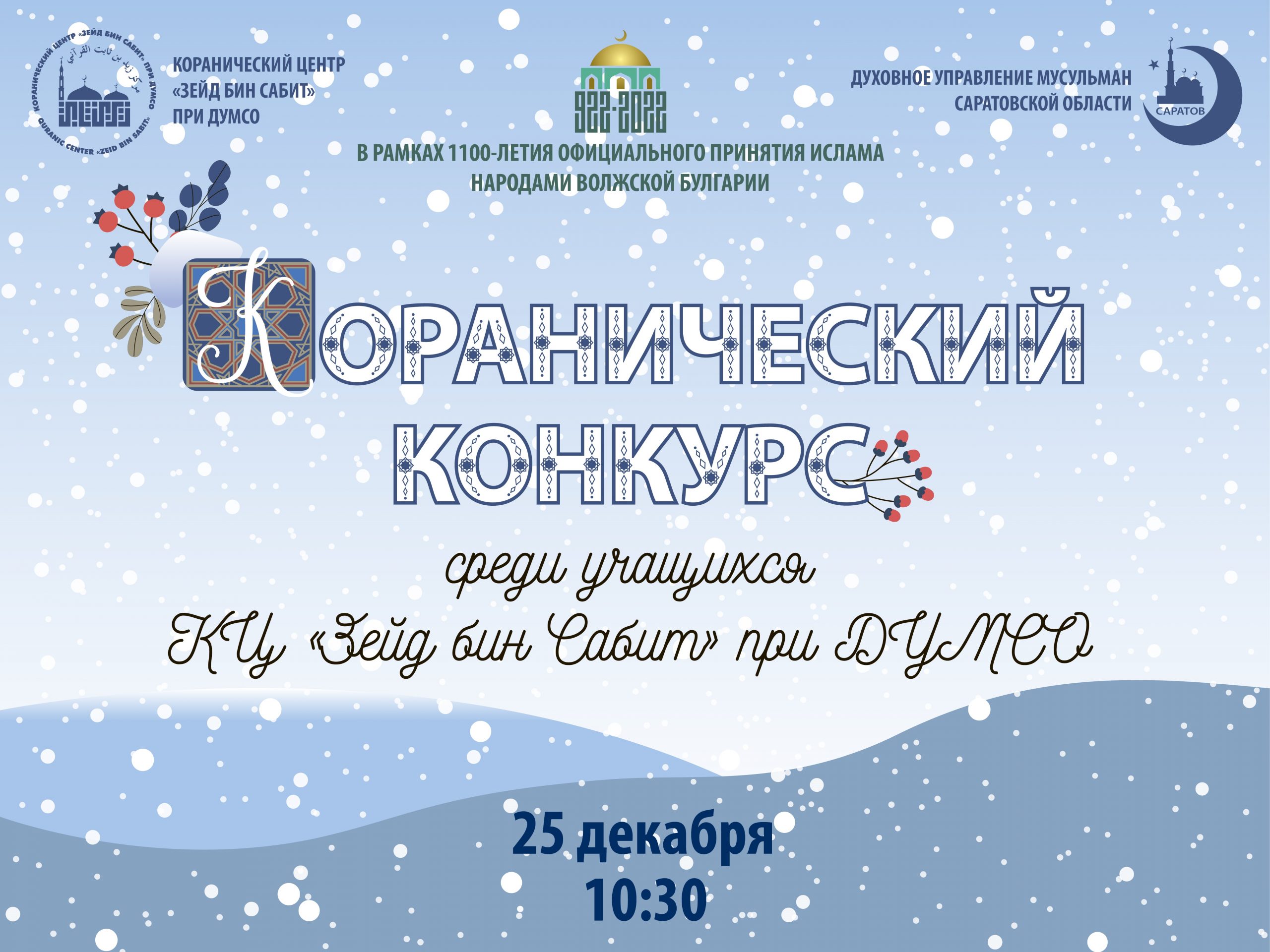 25 декабря 2022 года в г.Саратове состоится коранический конкурс среди учащихся коранического центра «Зейд бин Сабит» при Духовном управлении мусульман Саратовской области.