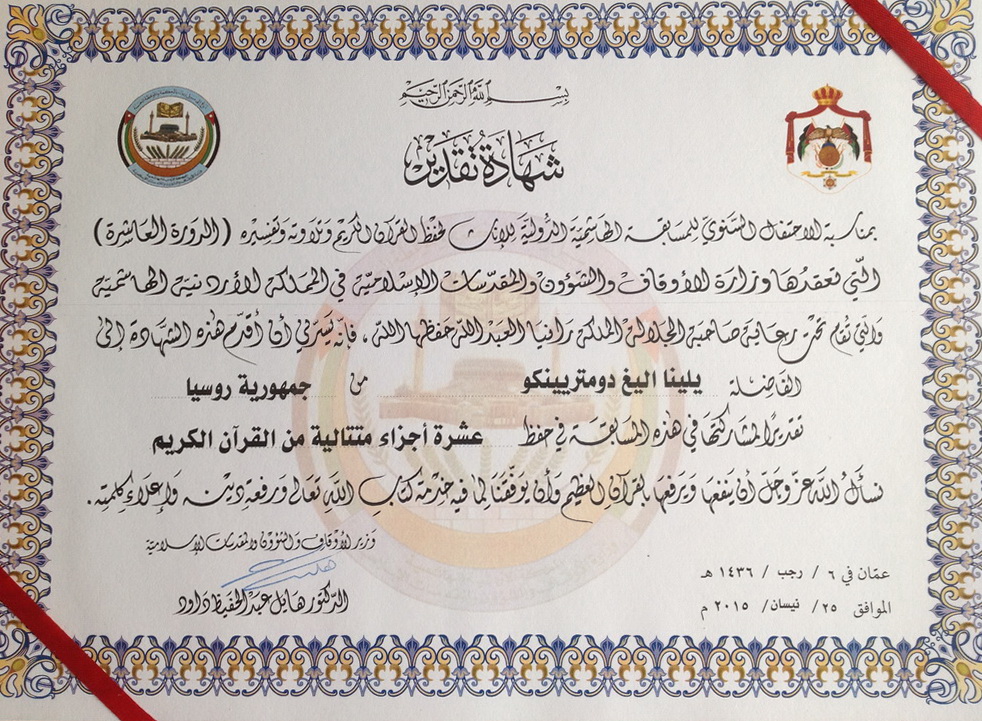 25 апреля прошла церемония награждения. От имени королевы Иордании представители Министерства вакфов и религиозных дел страны вручили Елене Дмитриенко диплом об участии и ценный приз.
