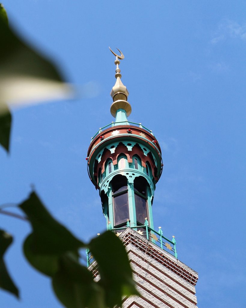 Здание мечети трёхэтажное, выполнено из чередующихся красного и белого кирпича, увенчано двумя куполами и минаретом высотой 46 м. Основной зал для намаза имеет площадь более 500 м².