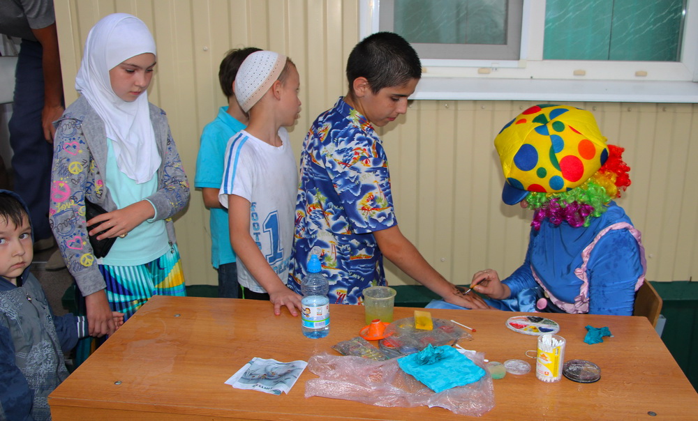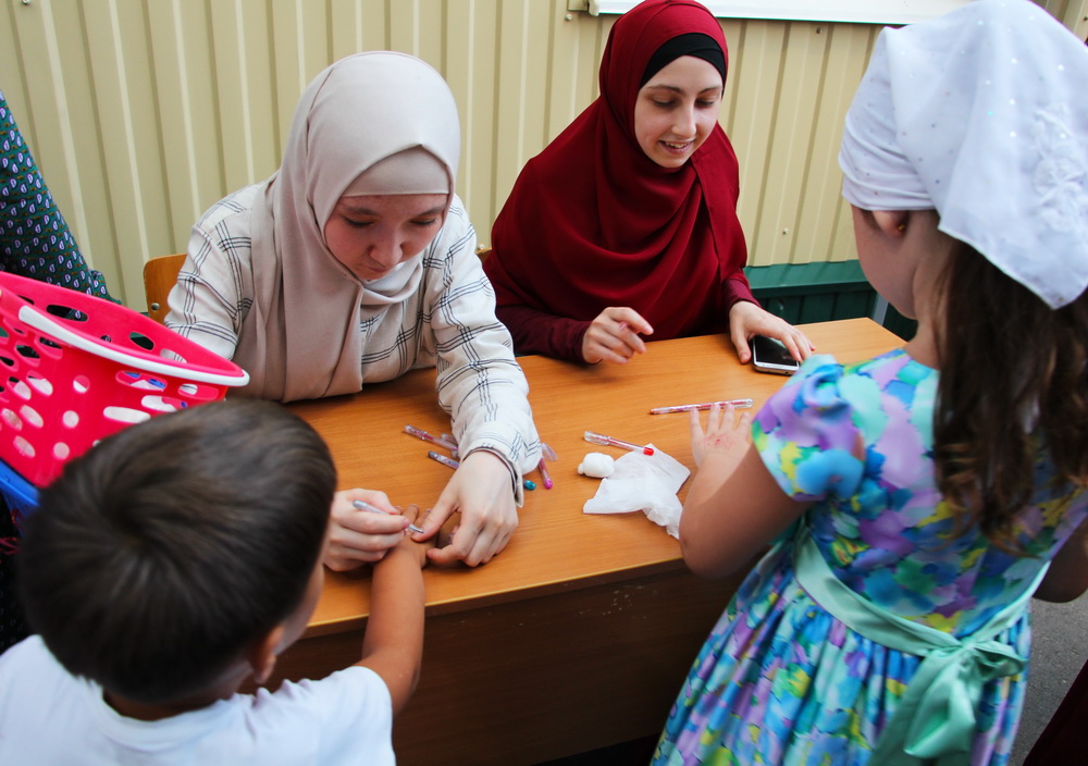 В назначенное время площадка перед соборной мечетью в миг заполнилась людьми – яблоку негде было упасть. Активистки общественной организации «Родник» до начала основного действия украшали маленькие ручки красивыми рисунками. Длинная очередь выстроилась к девушкам. «Нарисуйте мне мечеть», «а я хочу машину», «можно мне нарисовать паровозик», «а мне Миньона» – звучали разнообразные пожелания.