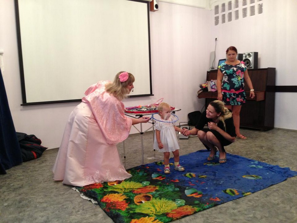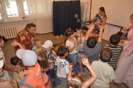 Встретив их восторженными криками, малыши принялись с интересом наблюдать за веселым шоу. Радости детей не было предела! Они прыгали, смеялись, бегали за мыльными пузырями. Почти каждому удалось оказаться внутри огромного пузыря.