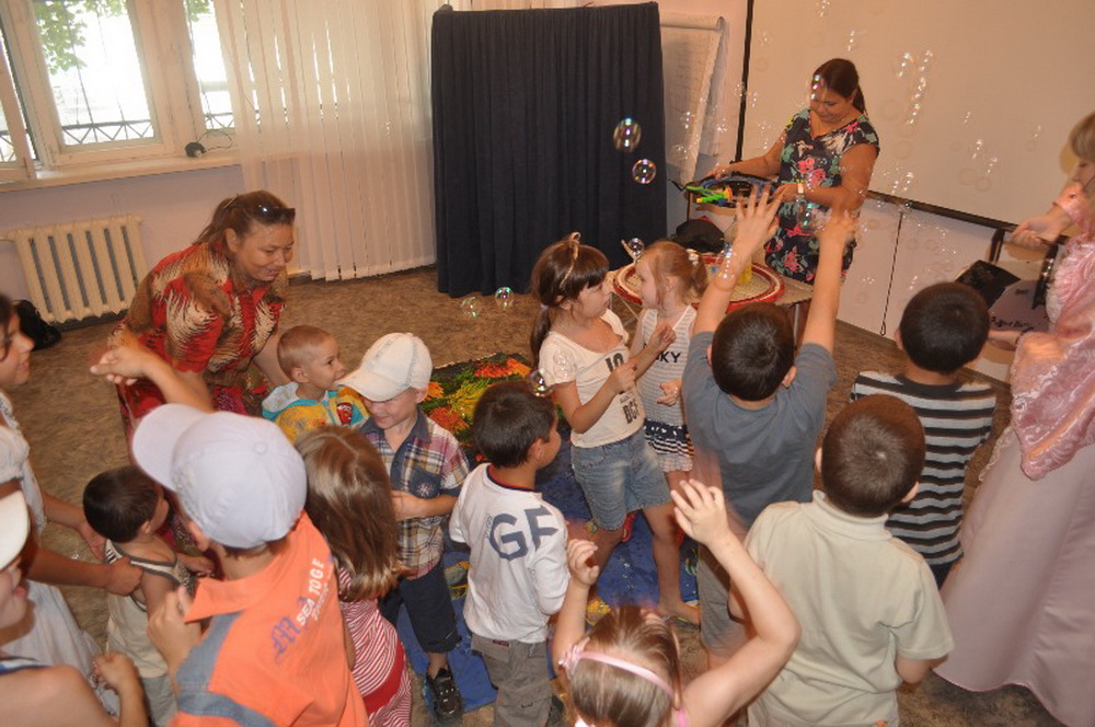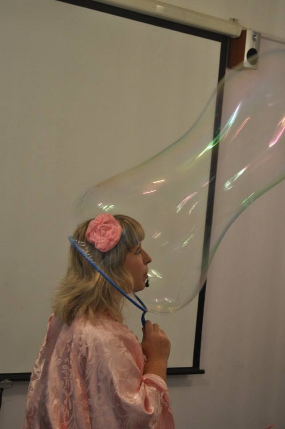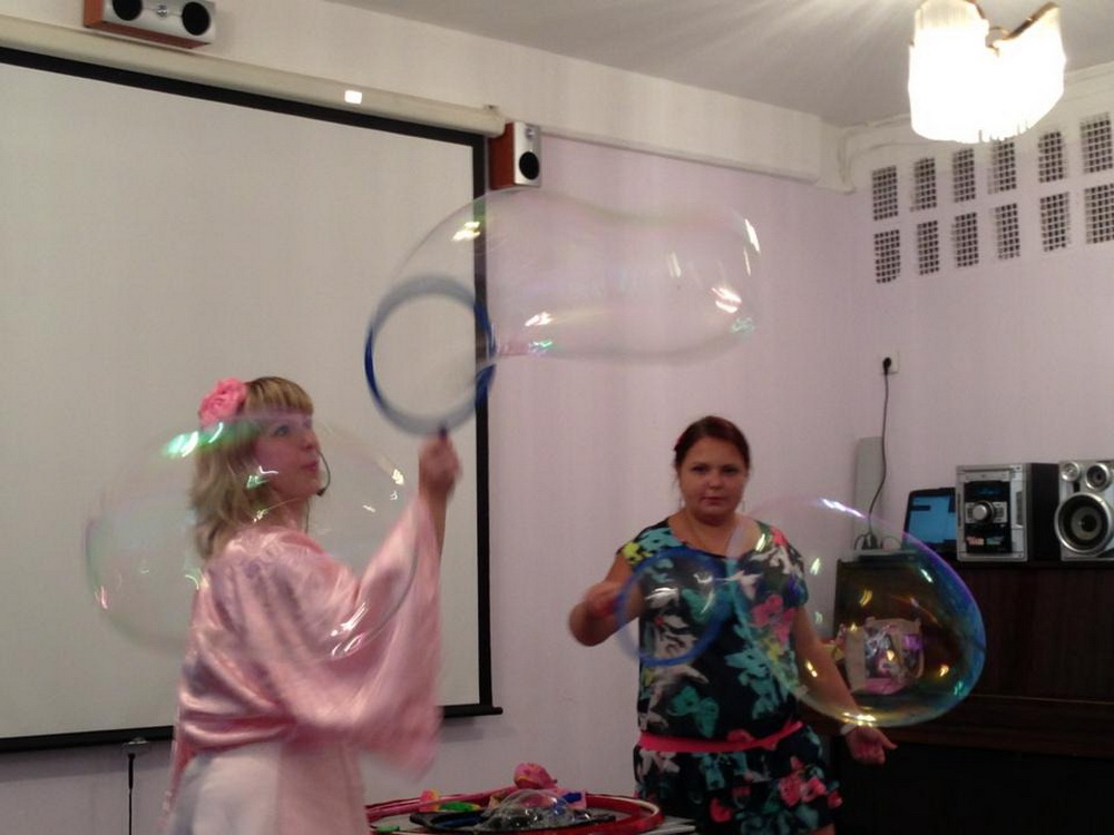 После недолгого общения, дети были приятно удивлены новым гостям — вместе с мусульманками порадовать ребят приехали гости со специальным шоу мыльных пузырей.