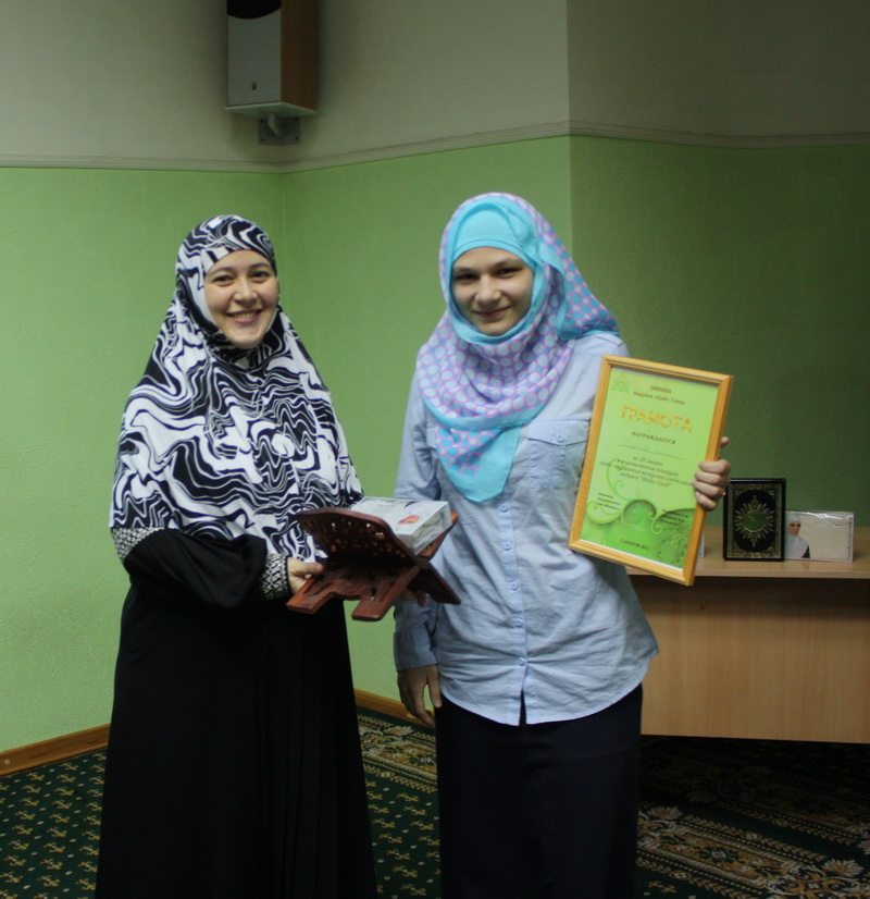 После выступления последней конкурсантки жюри подсчитало баллы каждой из участниц, и были подведены окончательные итоги. Почетное третье место заняла Наиля Сафарова, которой вручили грамоту и деревянную подставку под Коран. Второе место досталось Марьям Дашкиной, получившей экземпляр Священной Книги и праздничный платок.