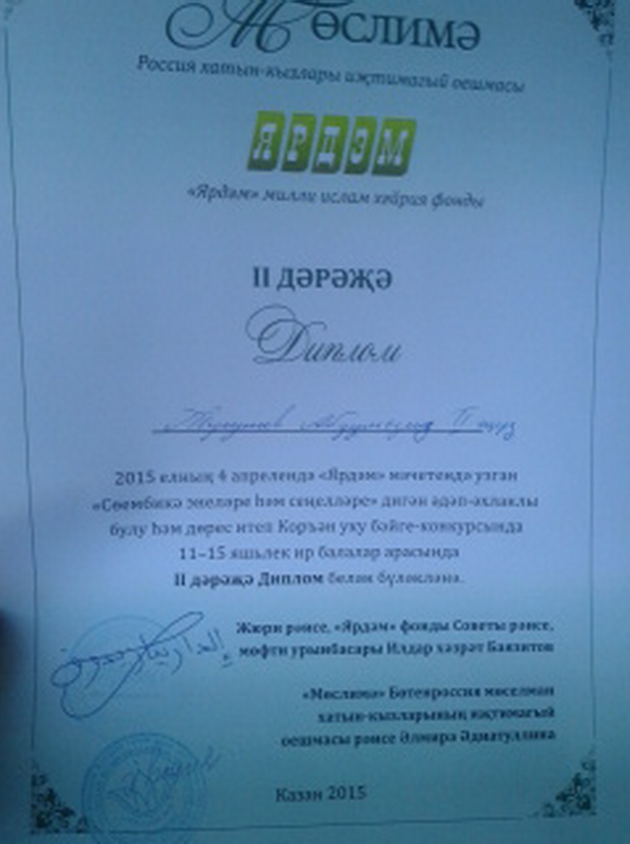 Как сообщил отец конкурсанта, имам Калининского района Усман-хаджи Тугушев, его сын впервые участвовал в подобных интеллектуальных состязаниях. «Как и всем участникам, Абдулазизу задавали вопросы по религии, а также истории выдающихся личностей татарского народа. Помимо этого, он выступил в номинации «Чтение наизусть 29 и 30 Джузов Священного Корана», — сказал Усман-хаджи.
