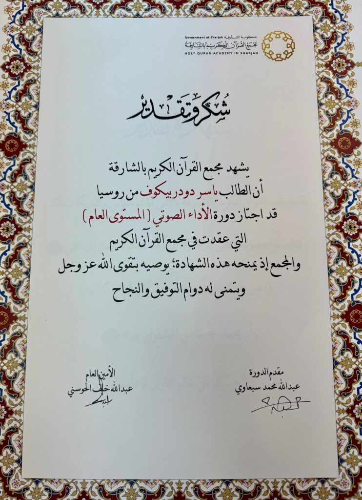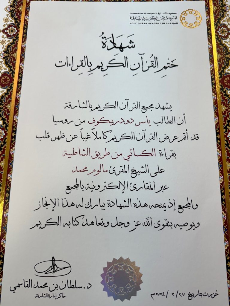В дни Благословенного Рамадана, 24-28 марта 2024 года, в Академии Священного Корана в г.Шарджа (ОАЭ) хафиз Корана Ясир Додарбеков прочитал наизусть весь текст Книги Аллаха и подтвердил иджазу по заучиванию Священного Корана в кыраате аль-Кисаи.