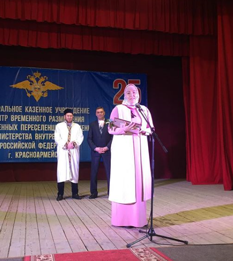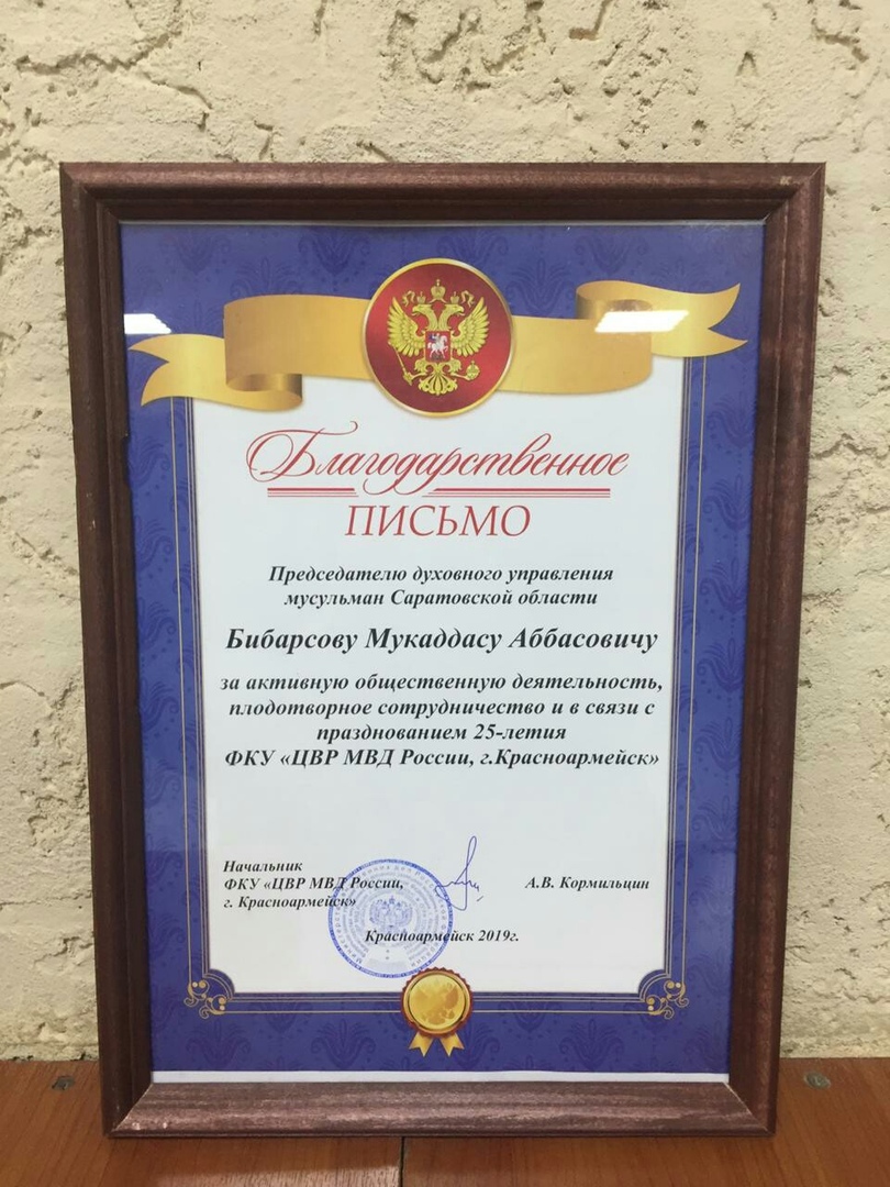 Затем состоялась церемония награждения почетными грамотами всех, кто внес свой вклад в работу Центра временного размещения вынужденных переселенцев и беженцев в г.Красноармейске. Так, руководство учреждения отметило Духовное управление мусульман Саратовской области и передало благодарсименное письмо на имя муфтия региона Мукаддас-хазрата Бибарсова.