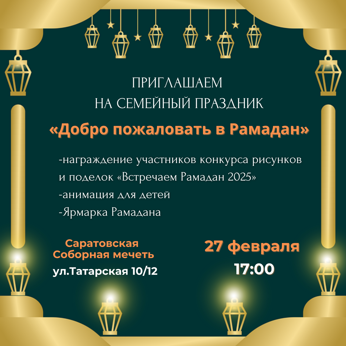 Мусульман города Саратова приглашают встретить Священный Рамадан семьями. 27 февраля 2025 года в Соборной мечети состоится семейное мероприятие «Добро пожаловать в Рамадан!».