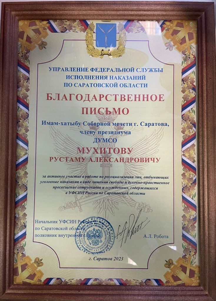 По завершении рабочего от руководства УФСИН России по Саратовской области за активное участие в работе по ресоциализации лиц, отбывающих уголовные наказания в виде лишения свободы и духовно-нравственное просвещение сотрудников и осужденных, содержащихся в УФСИН России по Саратовской области, благодарственным письмом отмечен член Президиума ДУМСО, имам-хатыб Саратовской Соборной мечети Рустам-хазрат Мухитов.