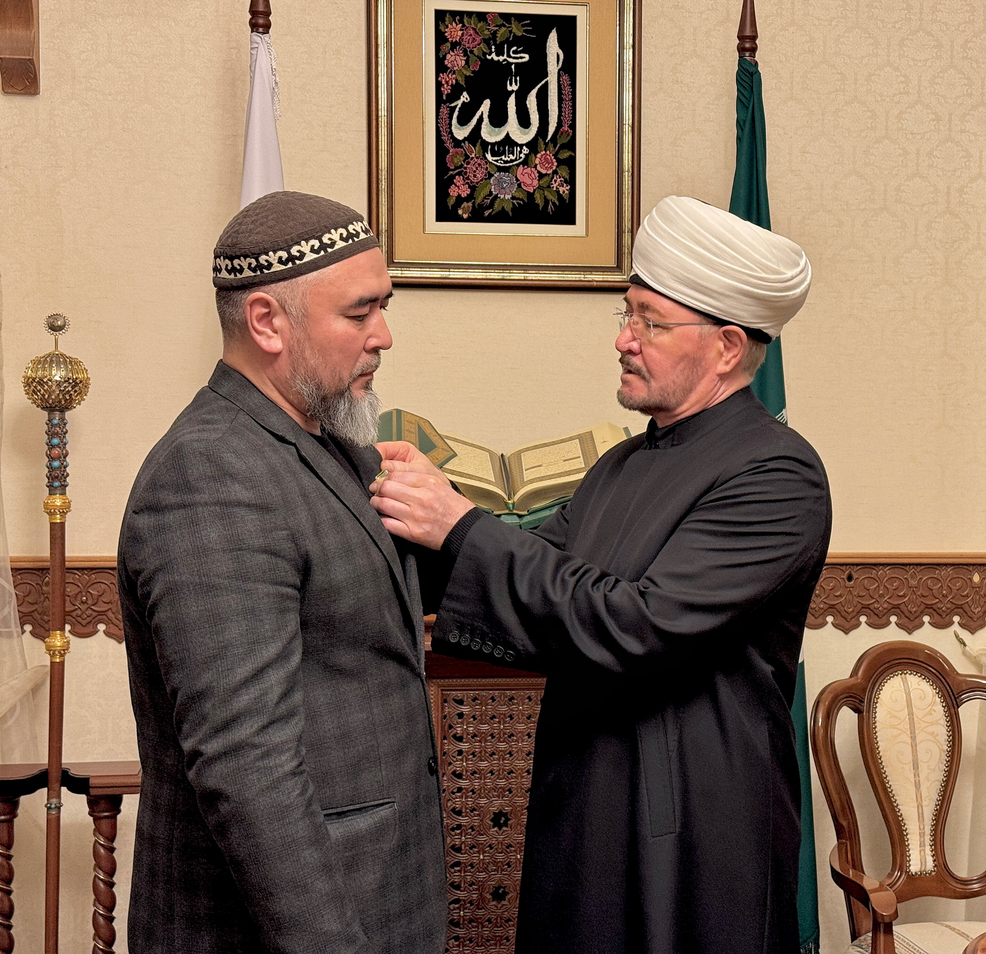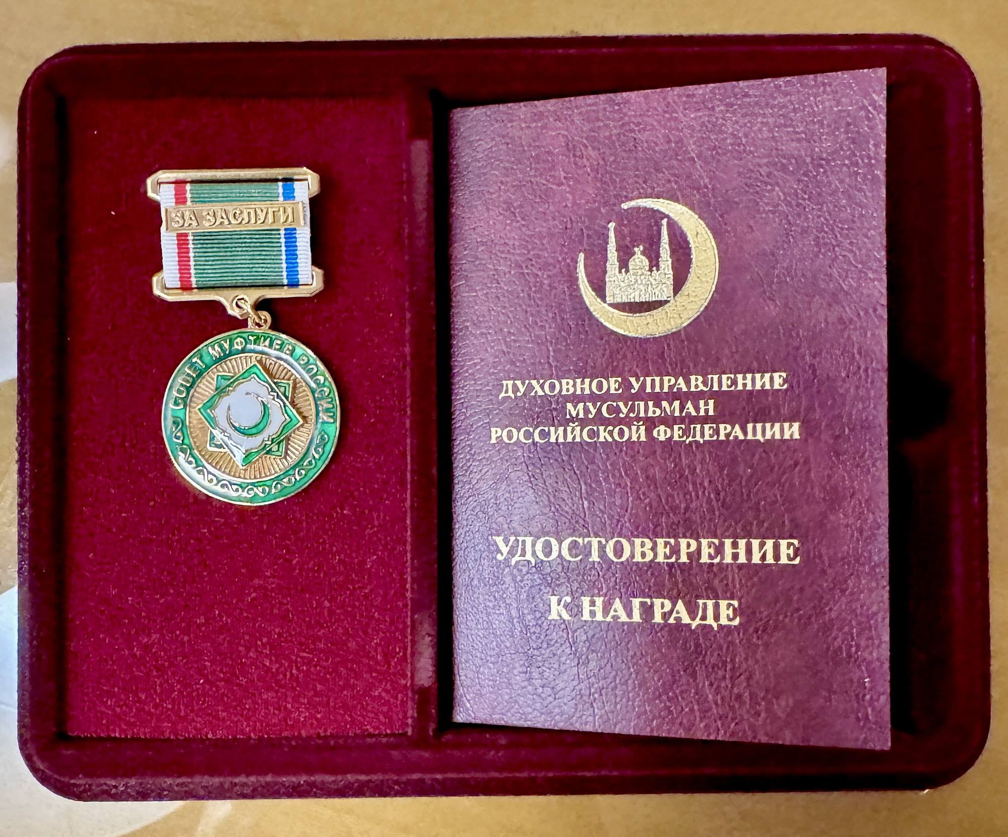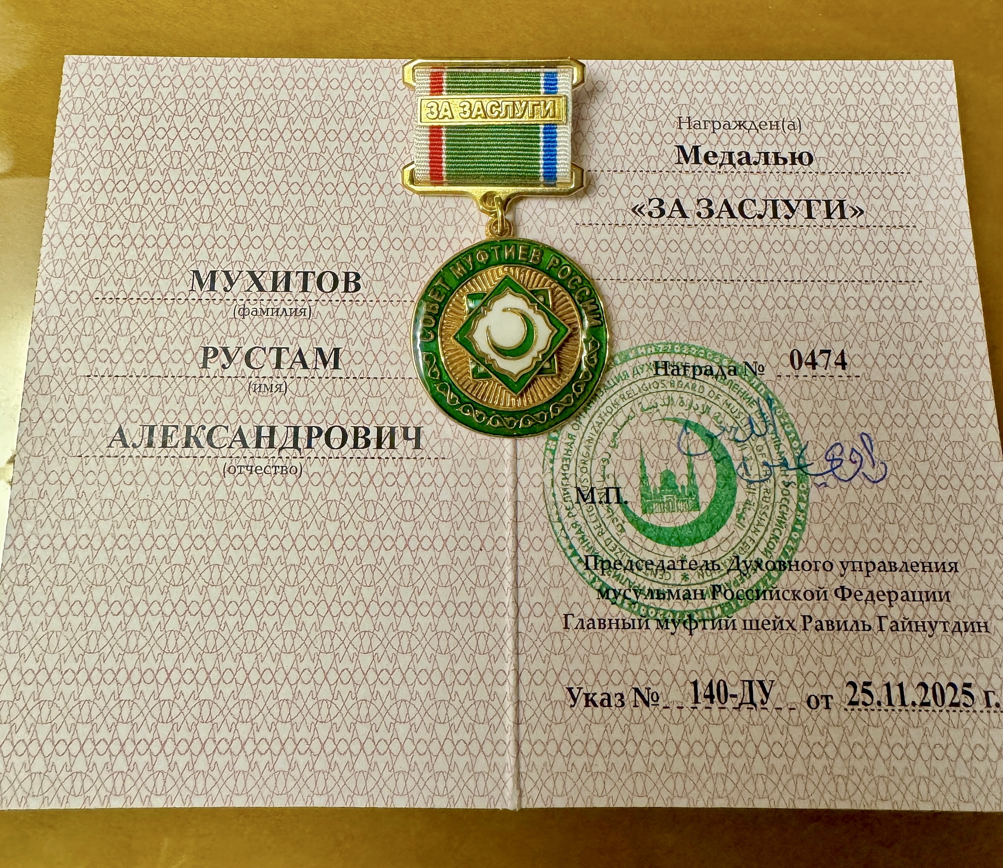 Высокая награда была вручена Рустаму-хазрату Мухитову «за самоотверженное служение, духовное наставничество и проявленную стойкость в исполнении религиозного долга в зоне проведения специальной военной операции».