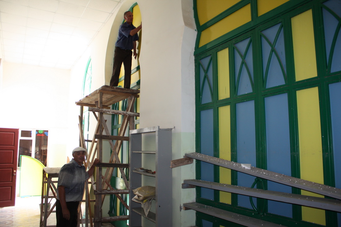 Кроме этого, будет произведен небольшой ремонт коридоров и внешних лестниц здания. Сегодня уже ведутся работы по покраске больших парадных дверей исламского комплекса в желтый и синий цвета.