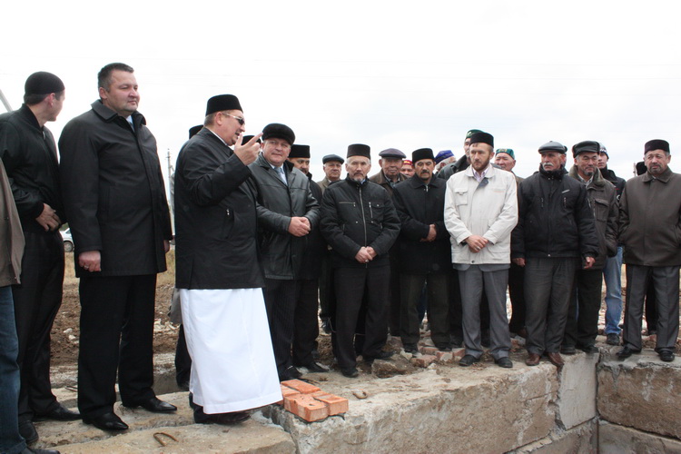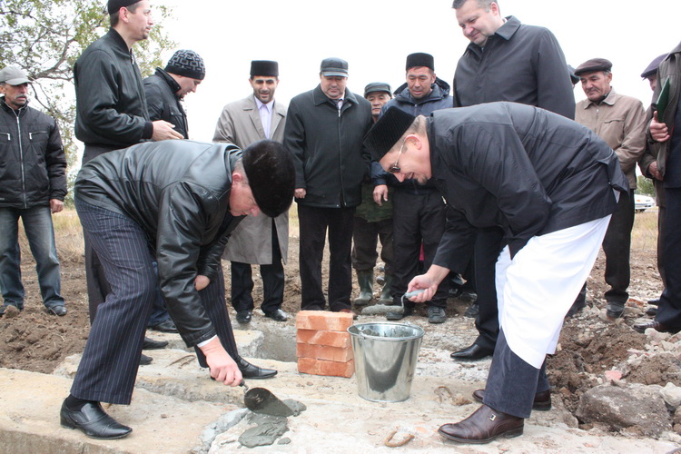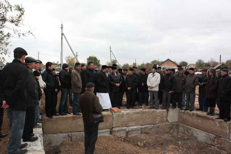 После приветственных слов и поздравлений муфтий Саратовской области Мукаддас-хазрат Бибарсов вместе с главой районной администрации и областным министром взяли в руки строительные мастерки и заложили первый камень под строительство будущей мечети.