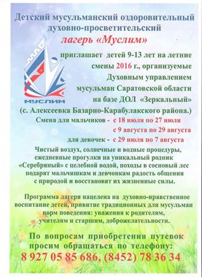 AAA_3758Детский духовно просветительский оздоровительный лагерь «МУСЛИМ», который проходит на базе ДОЛ «Зеркальный» Базарно-Карабулакского района Саратовской области, с нетерпением ждет юных друзей летом 2016 года.