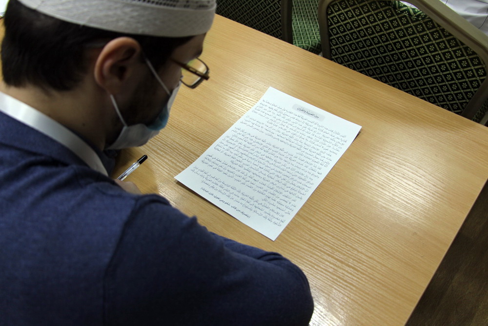 Вместе с коллегами из других исламских образовательных учреждений он оценивает работы участников олимпиады.