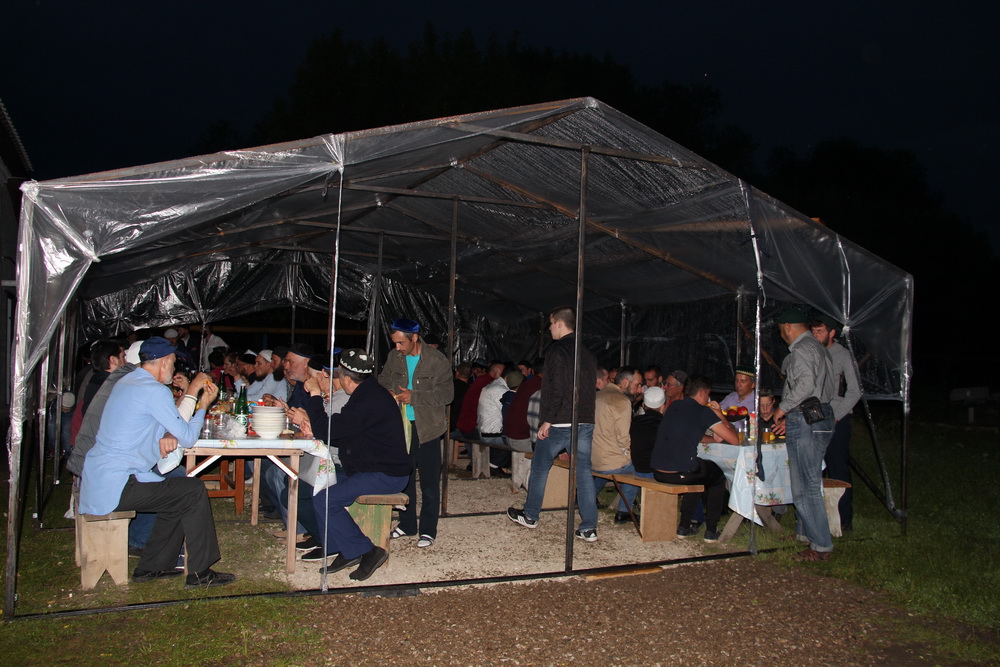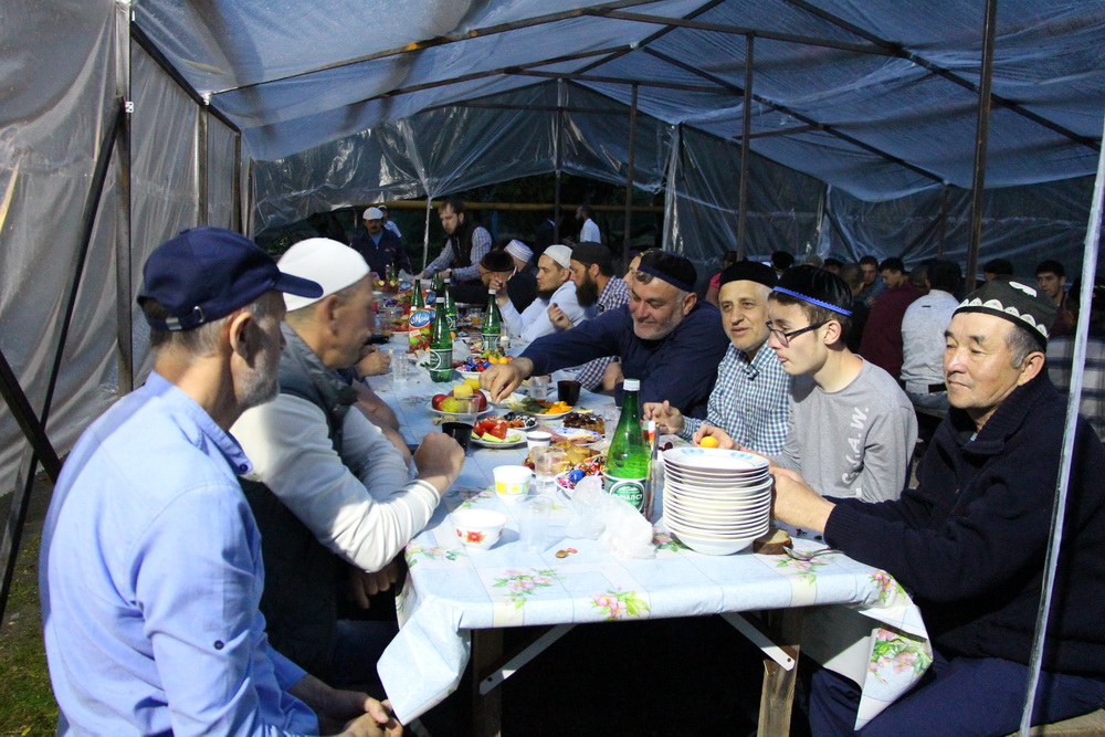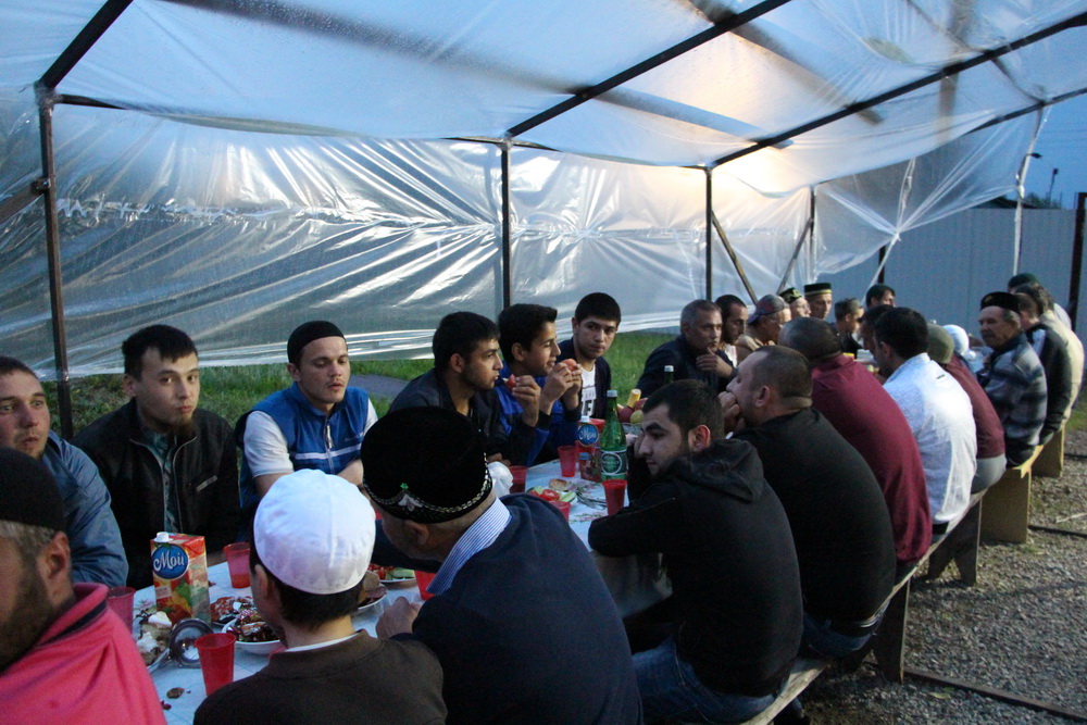 После завершения Магриб-намаза всех гостей вечера пригласили во двор мусульманского храма, где в специально установленном шатре их ждали праздничные угощения.