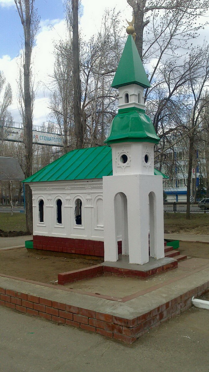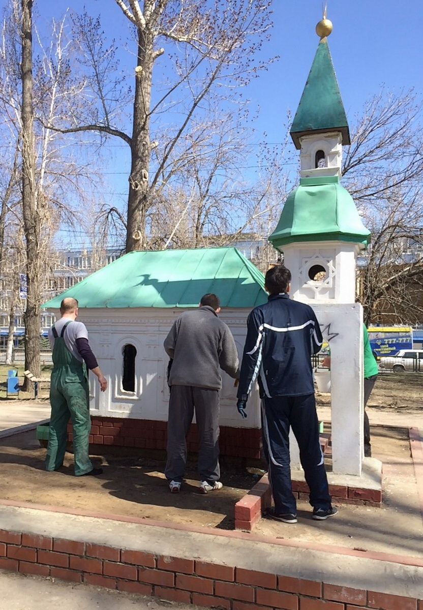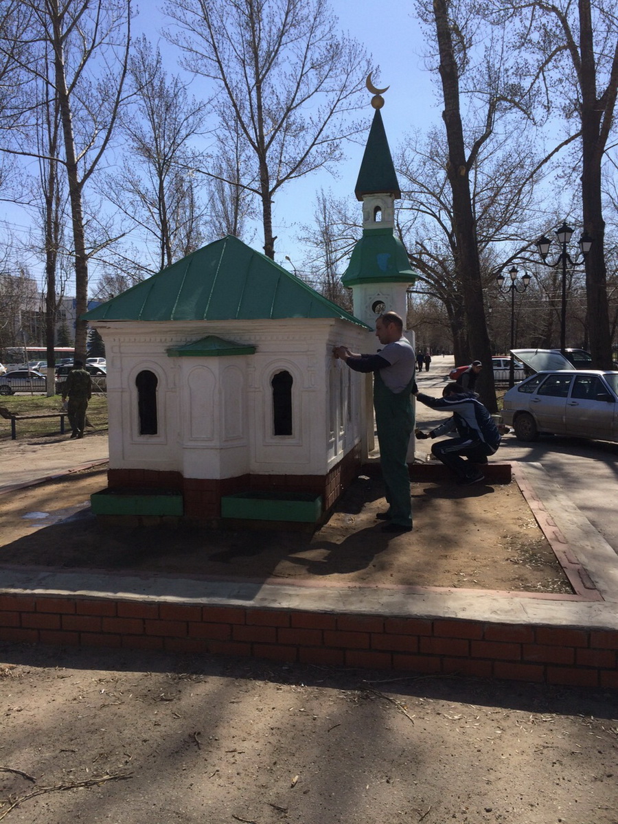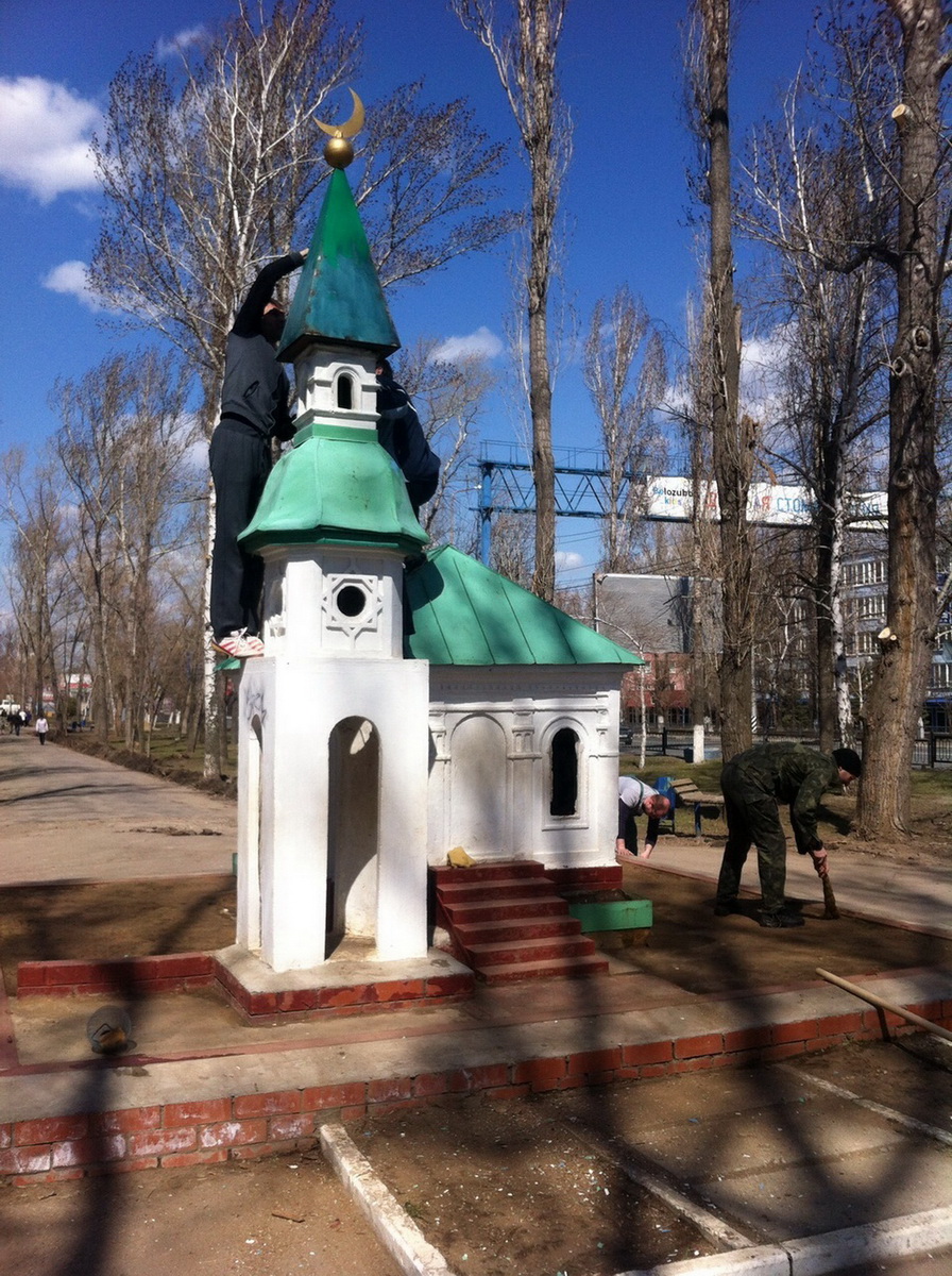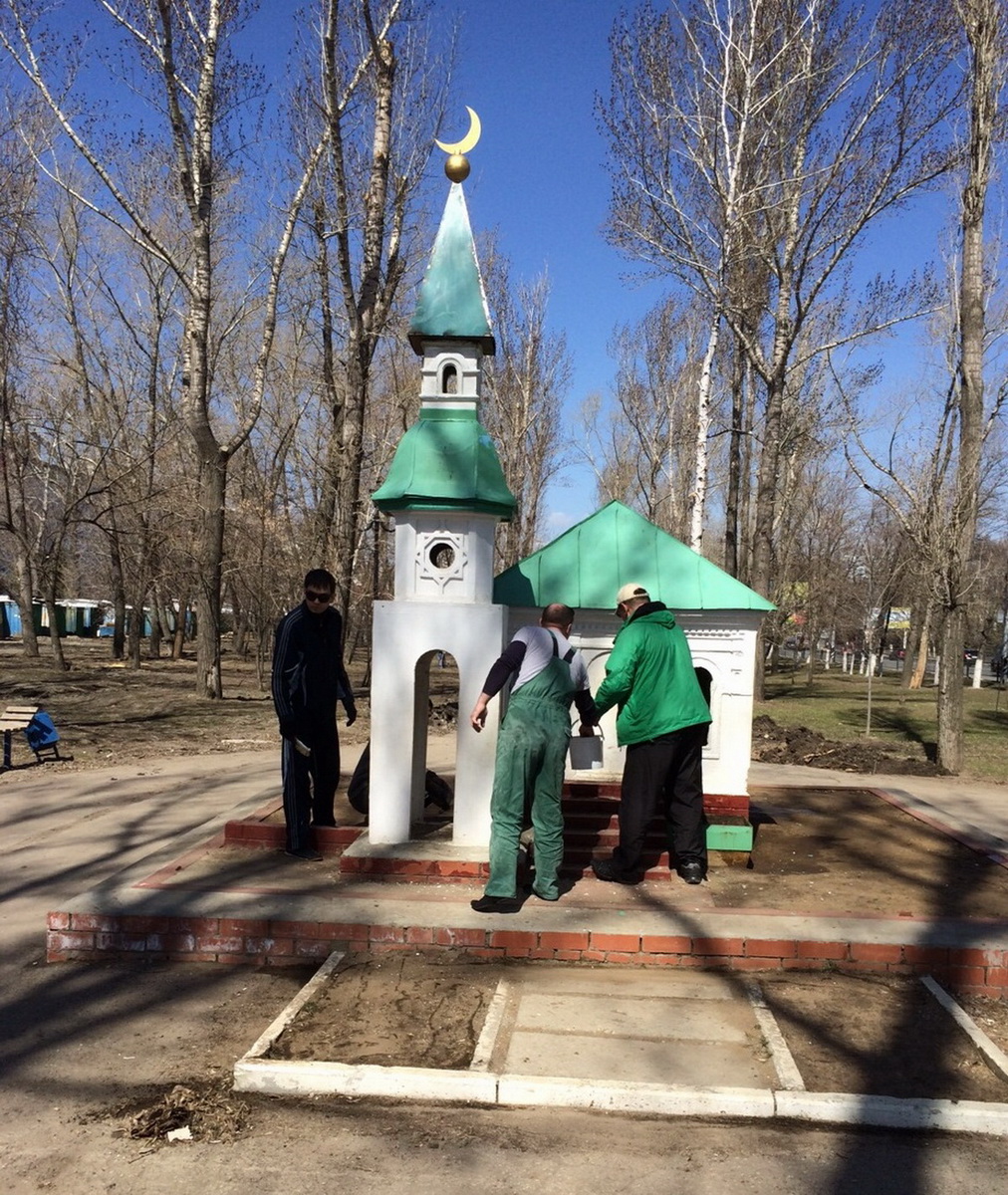 25 апреля мини-мечеть в аллее по проспекту 50-ти лет Октября засияла по-новому. Макет мусульманского религиозного сооружения был отреставрирован активом татарской молодежи.