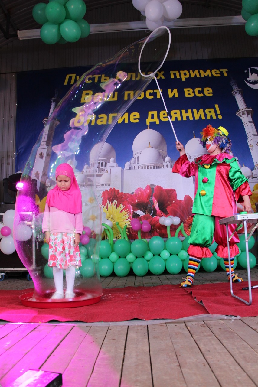 Праздник начался с забавного выступления клоунов, подаривших малышам интересное представление из мыльных пузырей. Ребят было не удержать. Они мчались на сцену, чтобы поучаствовать и поближе рассмотреть шоу с многочисленными переливающимися в воздухе шарами.