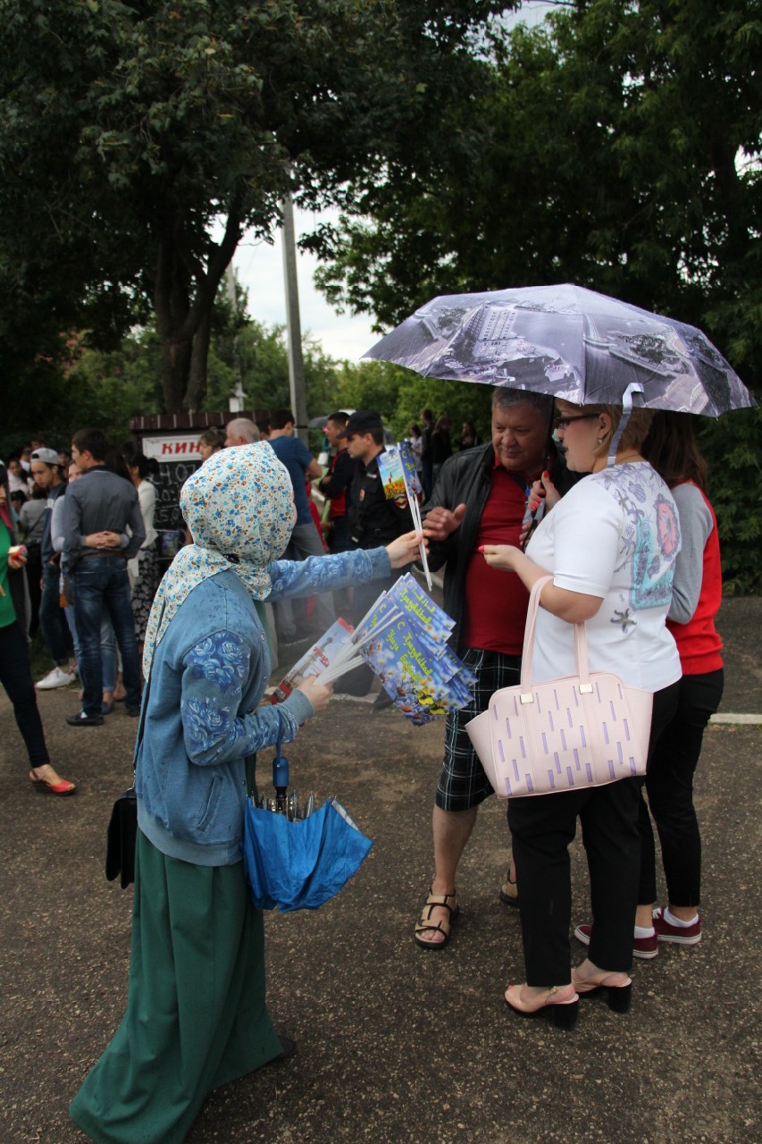 Чуть позже дождь все-таки усилился и перешел в ливень. Местами он притаивался, но затем наверстывал упущенное. Многих гостей, к сожалению, погода вынудила ретироваться, несмотря на творческое продолжение вечера. Однако желающих посмотреть культурную программу до конца осталось немало. Горожане расположились под навесами, а те, которым не достались укрытия, превратили зрительскую площадку в парад разноцветных зонтов.