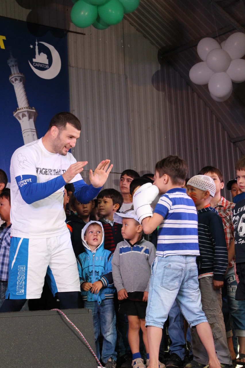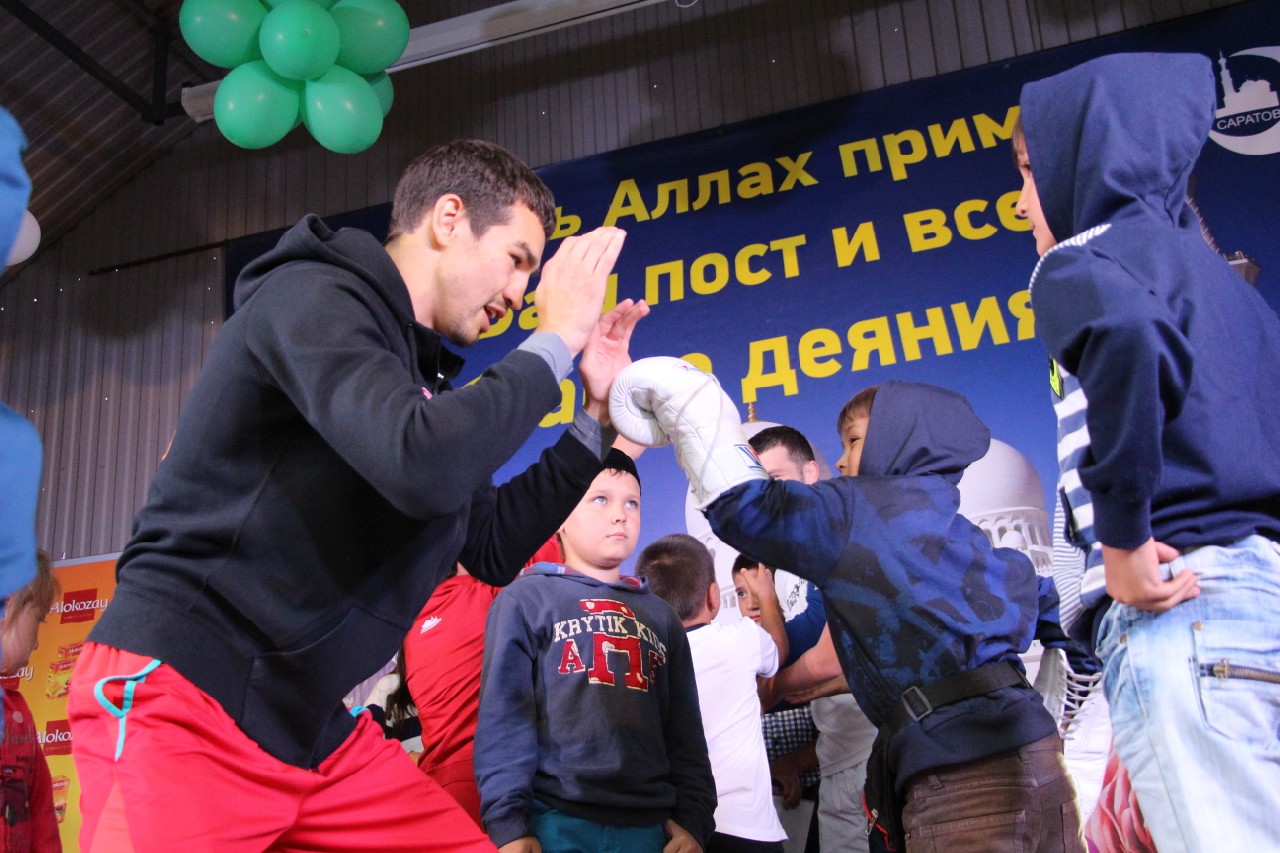 Выступления знаменитых саратовских спортсменов, чемпионов мира Саида-хаджи Детхаджиева, Артема Чеботарева и Даци Дациева были не менее привлекательны. Сначала они продемонстрировали для всех мастерство и талант в боевых искусствах, а затем провели мастер-классы для своих юных друзей. Дети, особенно мальчишки, восхищались импровизированной тренировкой. Они смогли примерить боксерские перчатки и испытать их на чемпионах.