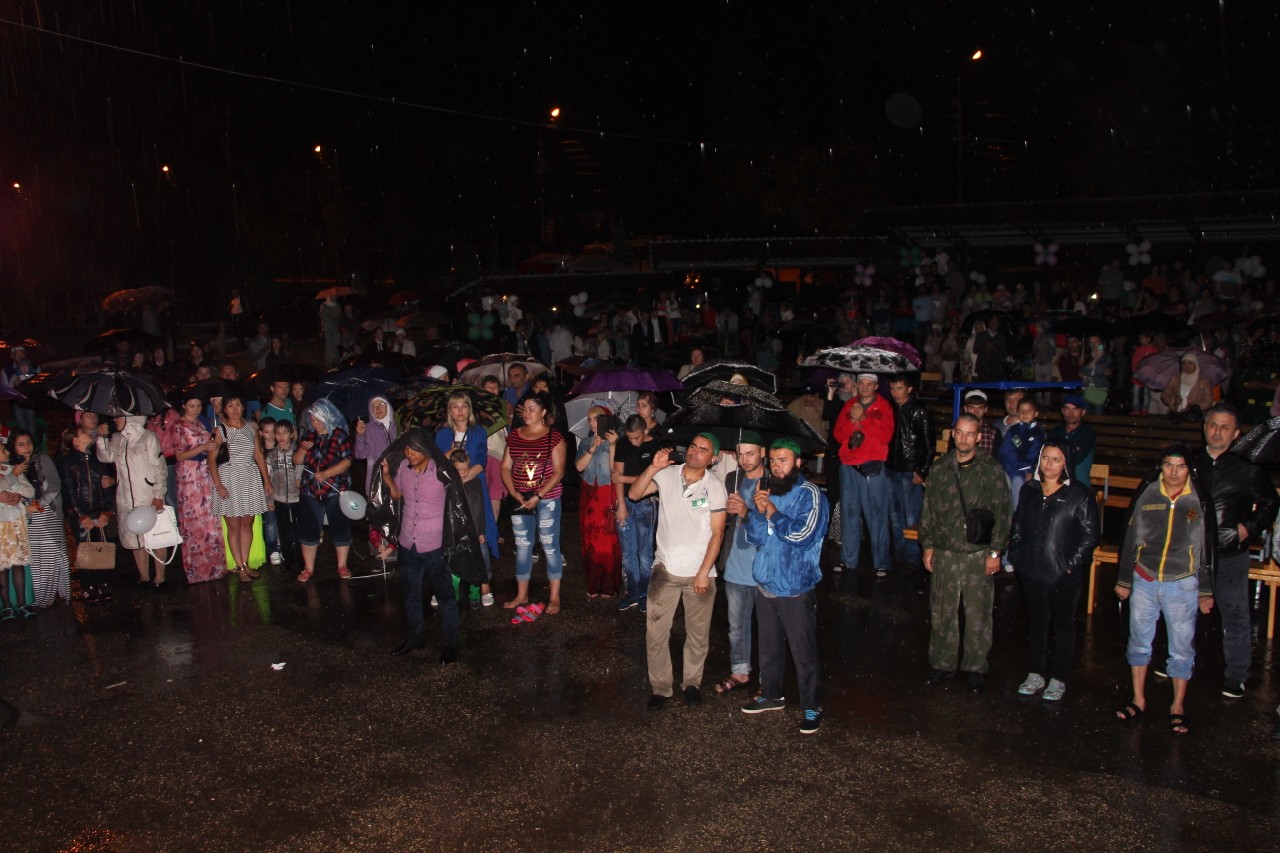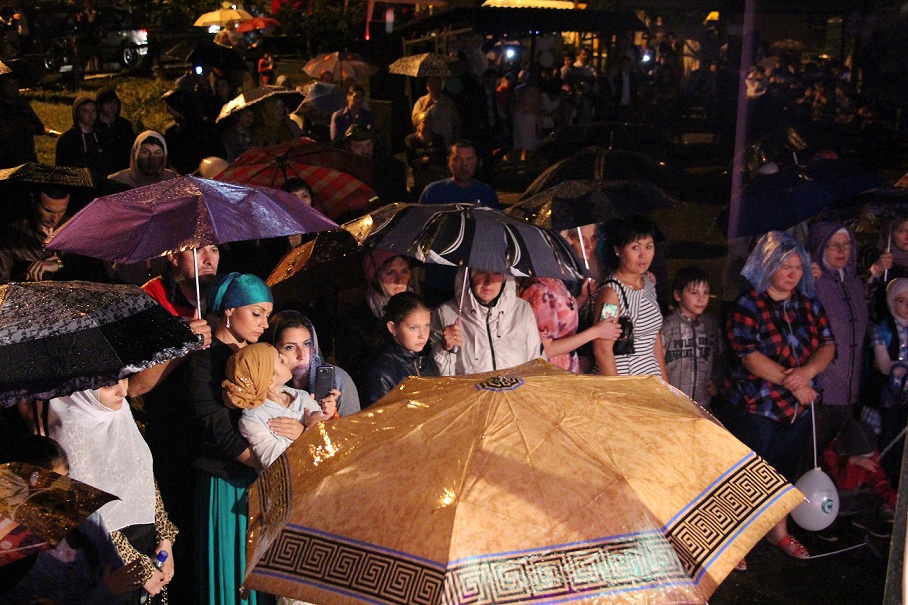 Капли дождя стекали по лицу, но никому это не мешало поднять голову к небу, чтобы восхититься торжественным красочным фейерверком, посвященным большому празднику «Ураза-байрам для всех – 2015».